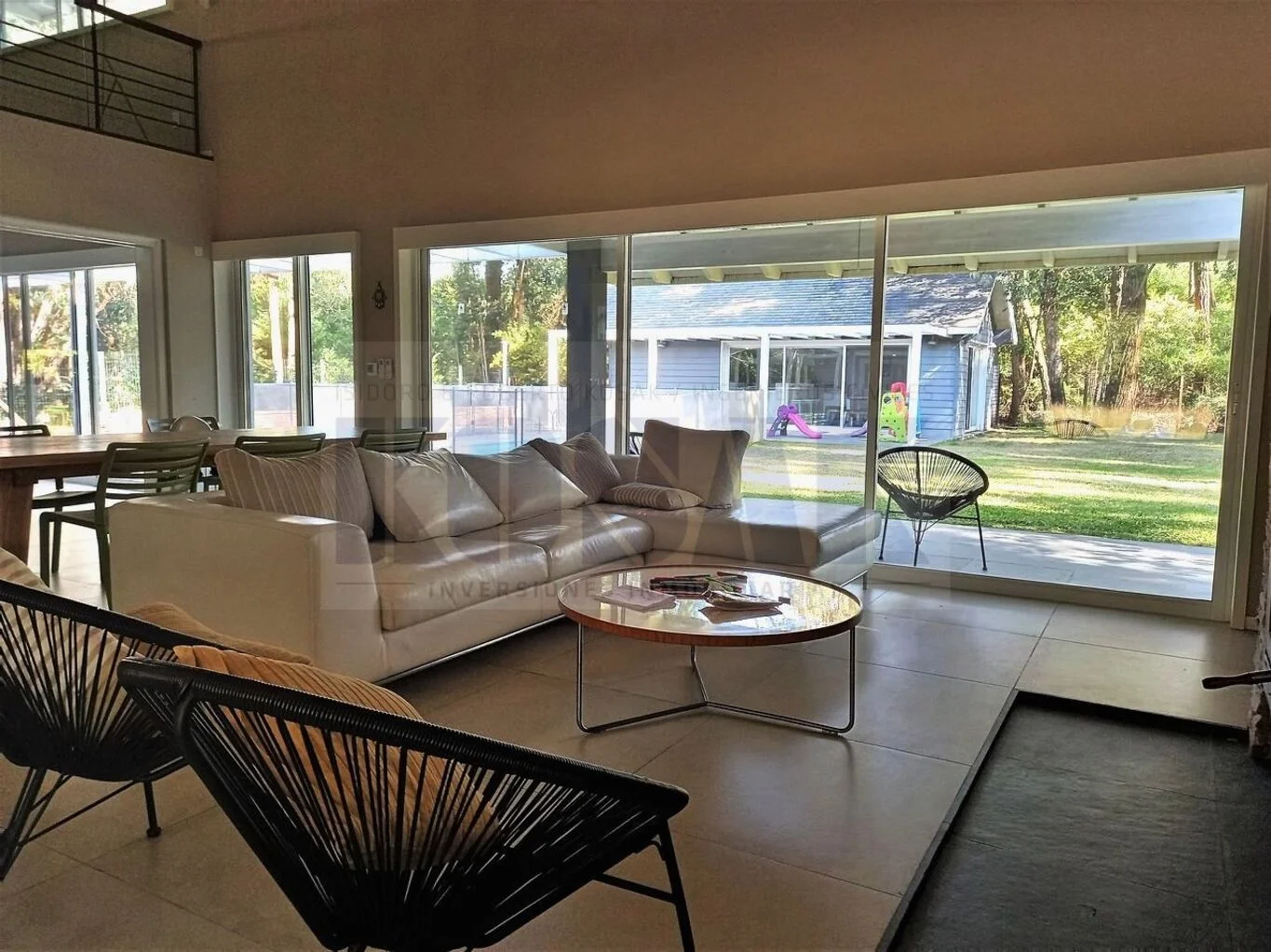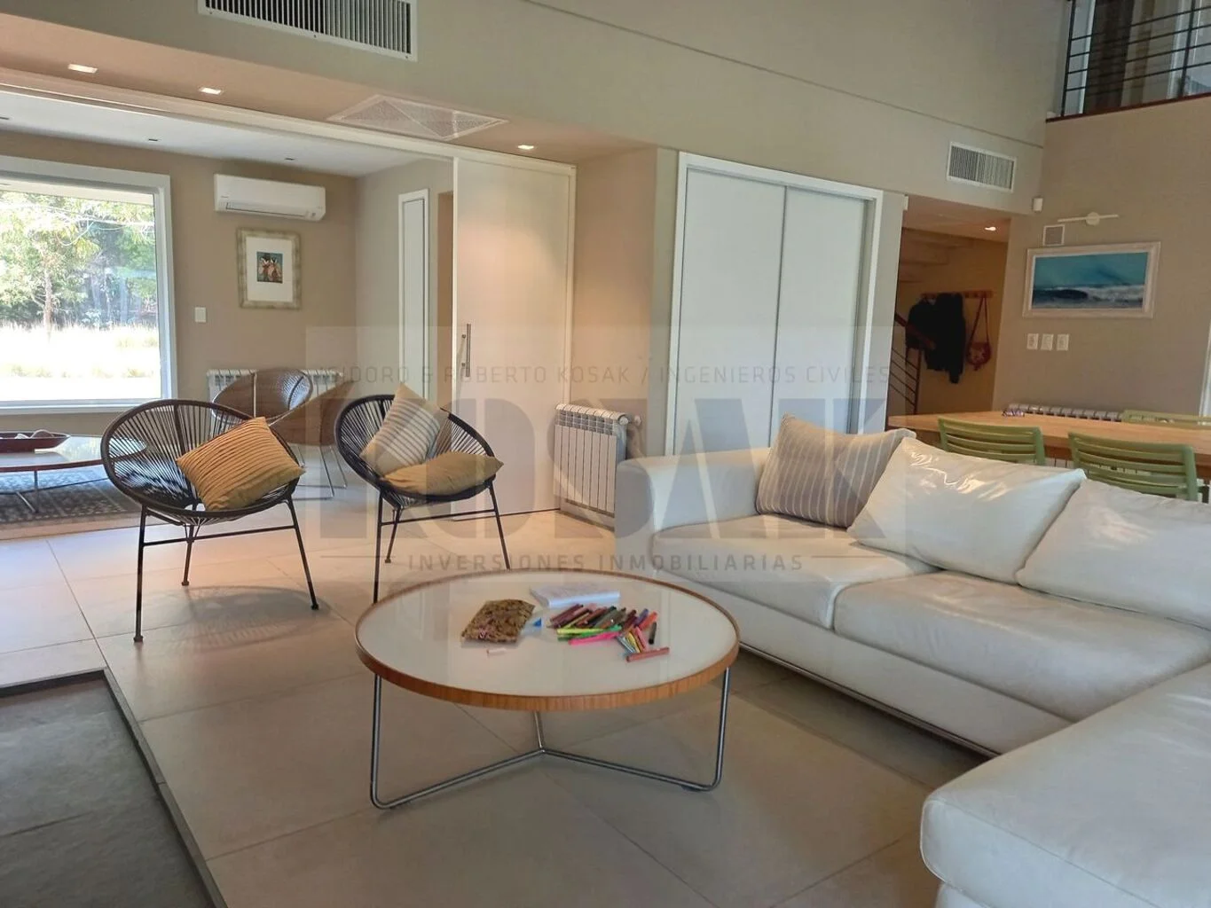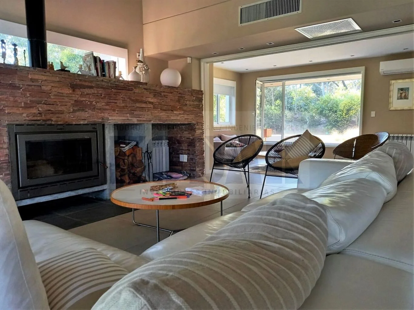 - Living principal, estufa a leña, amplios ventanales a jardines