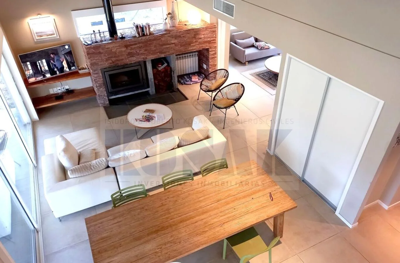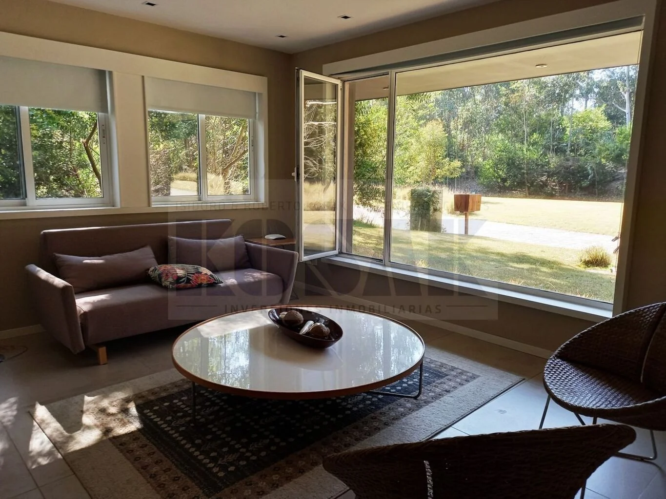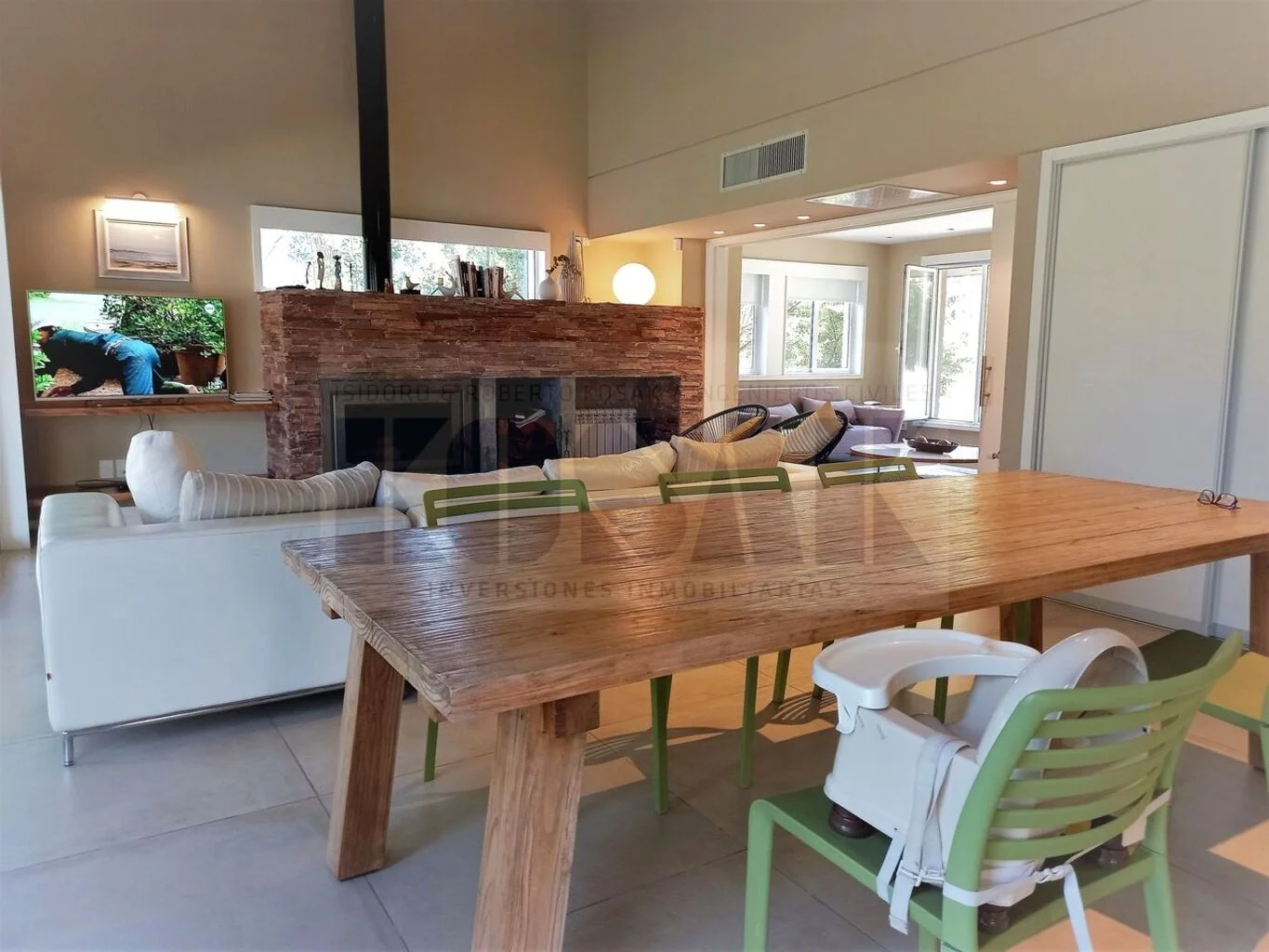 - Living principal, estufa a leña, amplios ventanales a jardines
