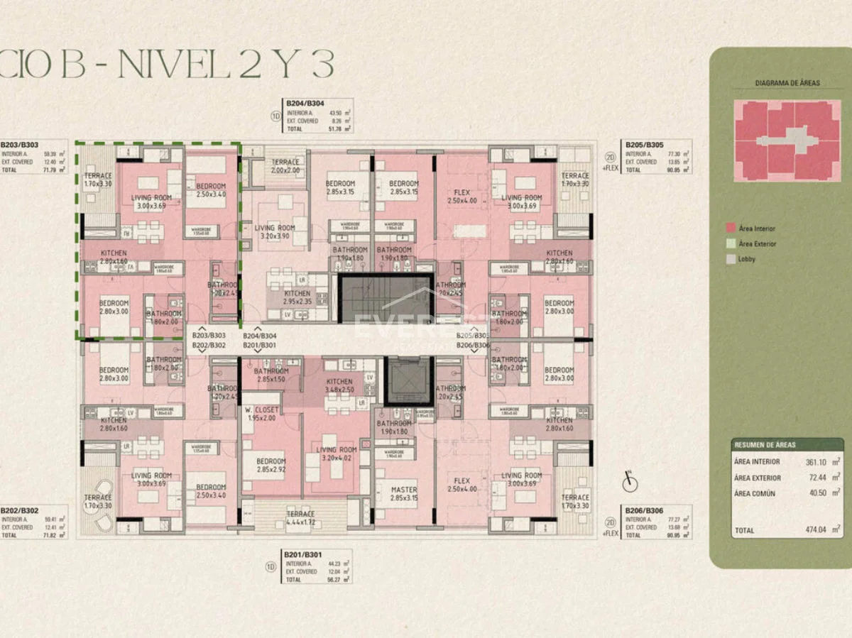 El precio publicado corresponde a la unidad B203, Encantador apartamento de 2 dormitorios en venta, con 59,39 m interiores y 12,4 m de terraza privada con parrillero, cochera incluida en el precio.