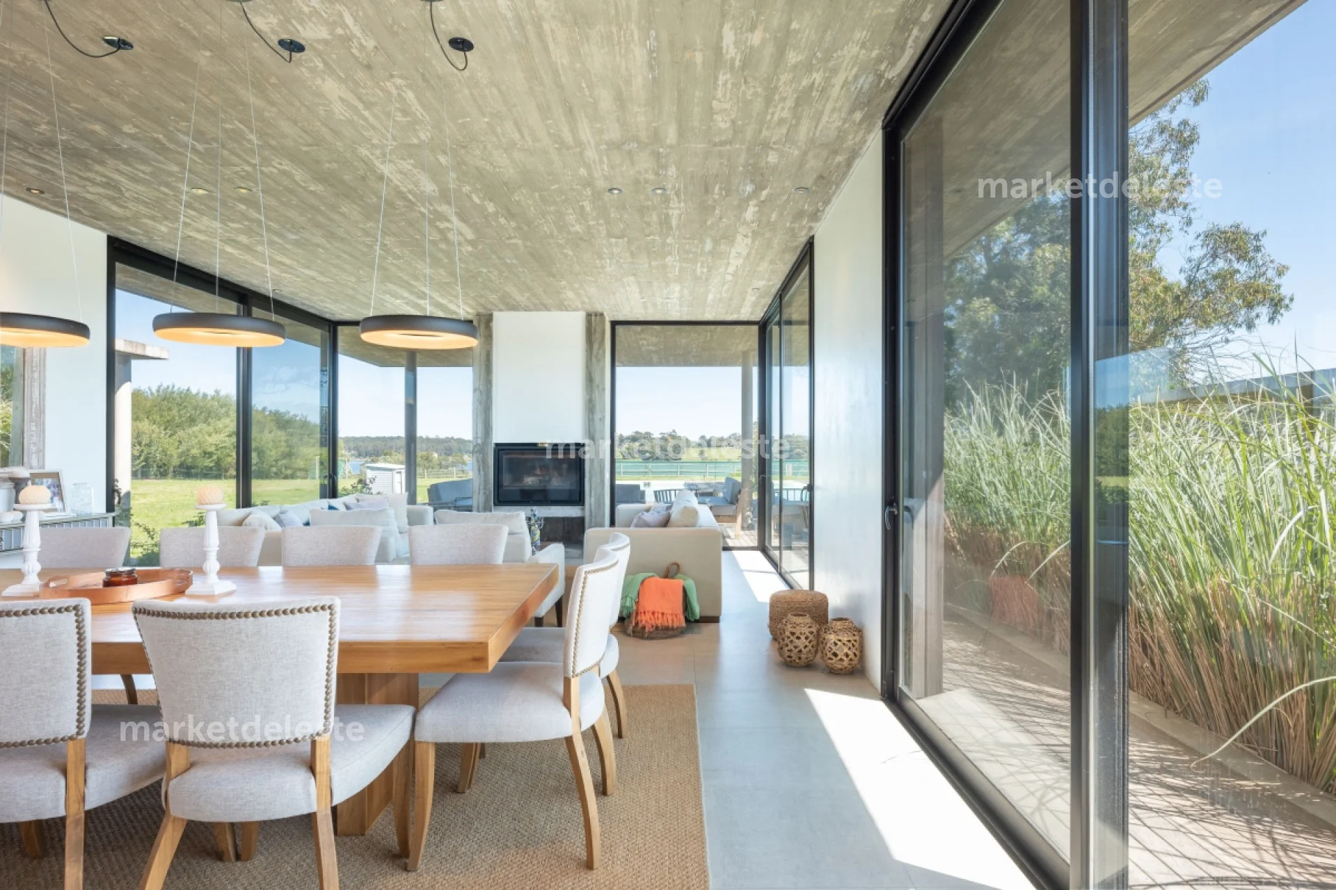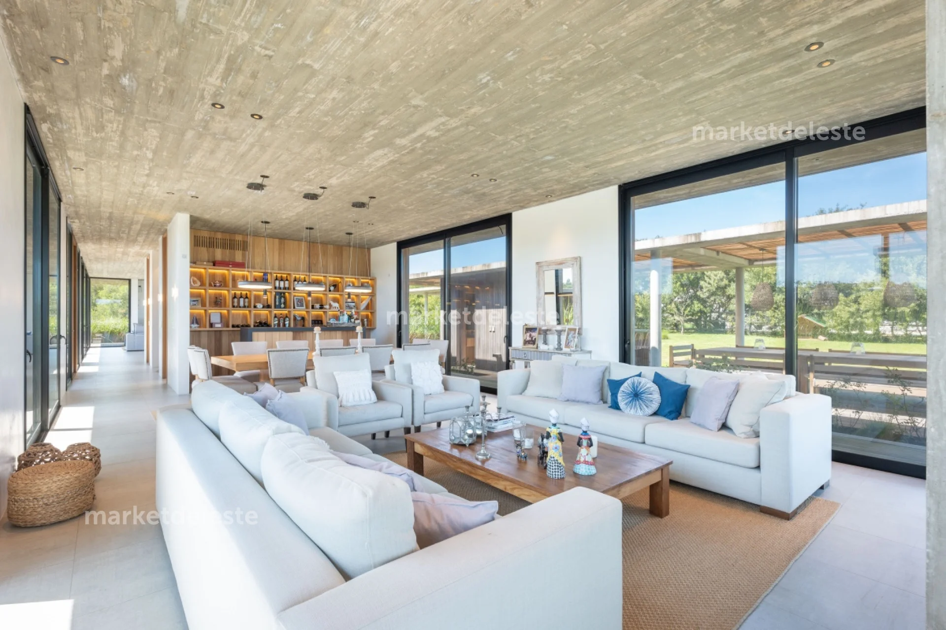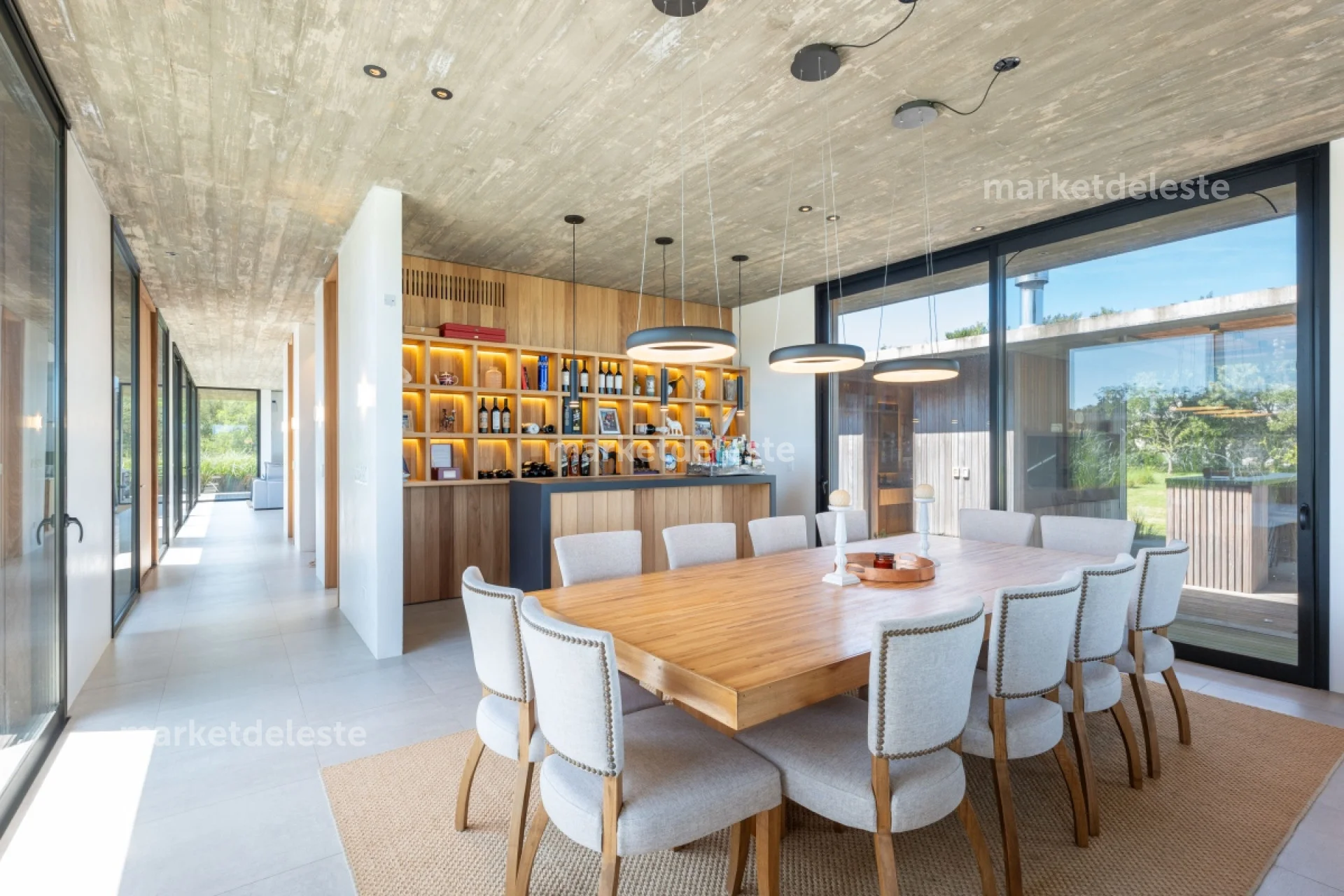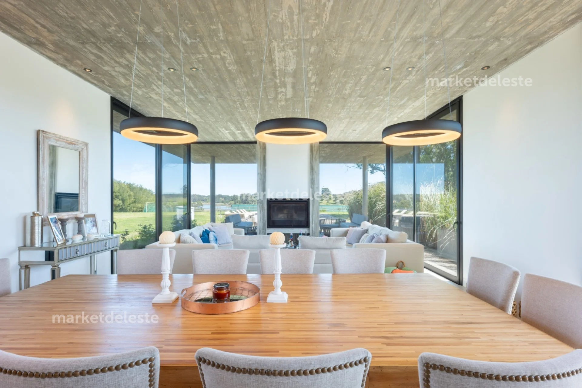 Esta magnifica casa de 4 dormitorios, 5 baños es la definición de lujo y confort. Sumamente luminosa, de amplios ventanales con vistas al verde, lagos y espectaculares arboledas. La casa consta de 2 modulos principales, en el modulo principal se encuentra el living comedor, cocina, comedor diario y toilette, seguido de este bloque, se encuentra el segundo bloque con 3 dormitorios en suite. Separaado casa con dormitorio de huespedes.