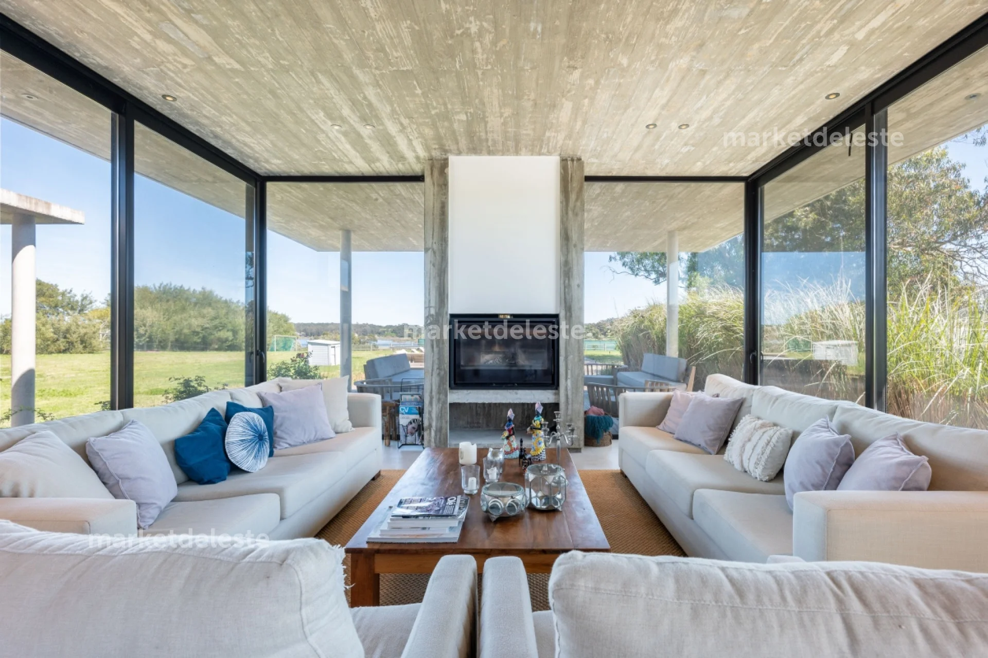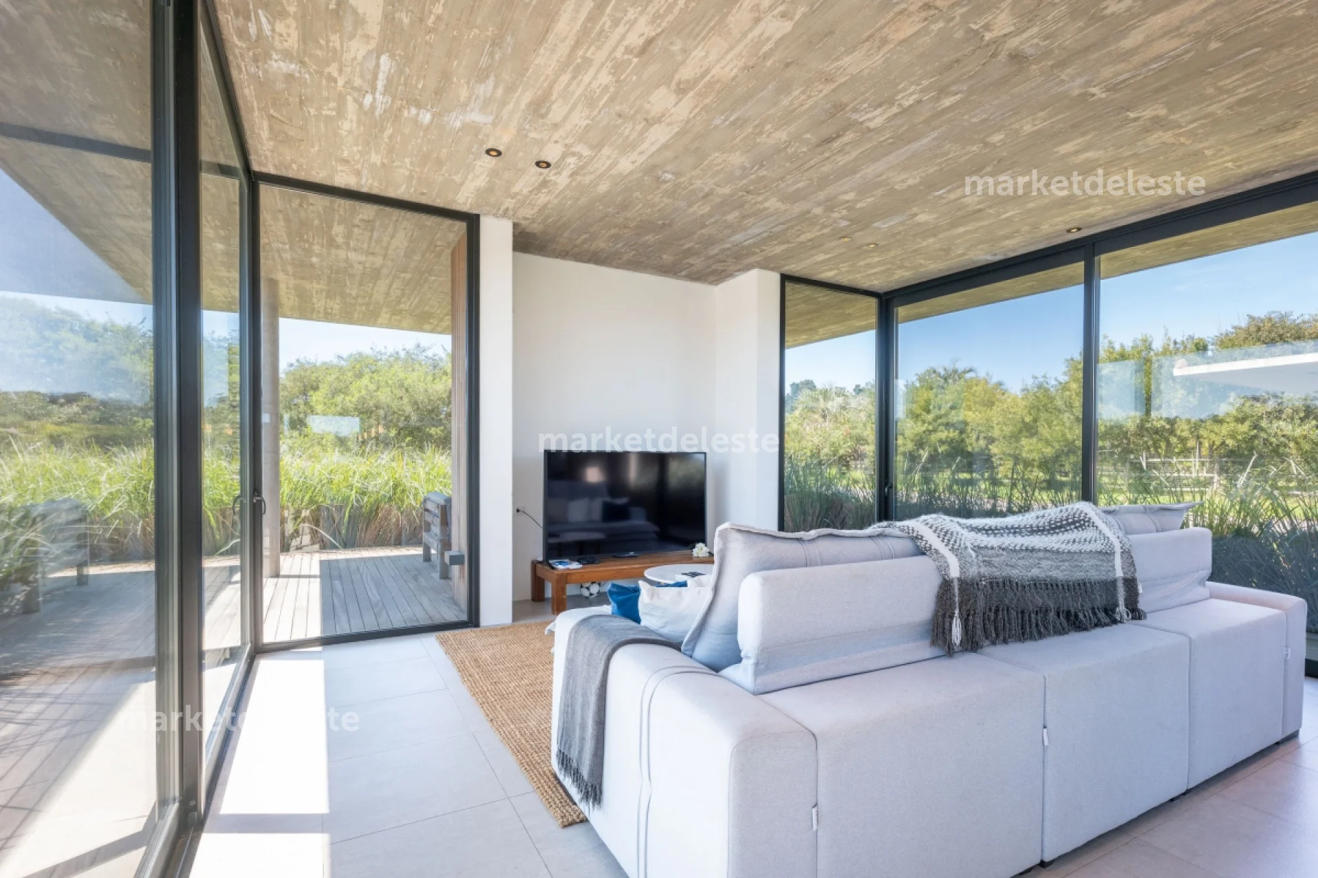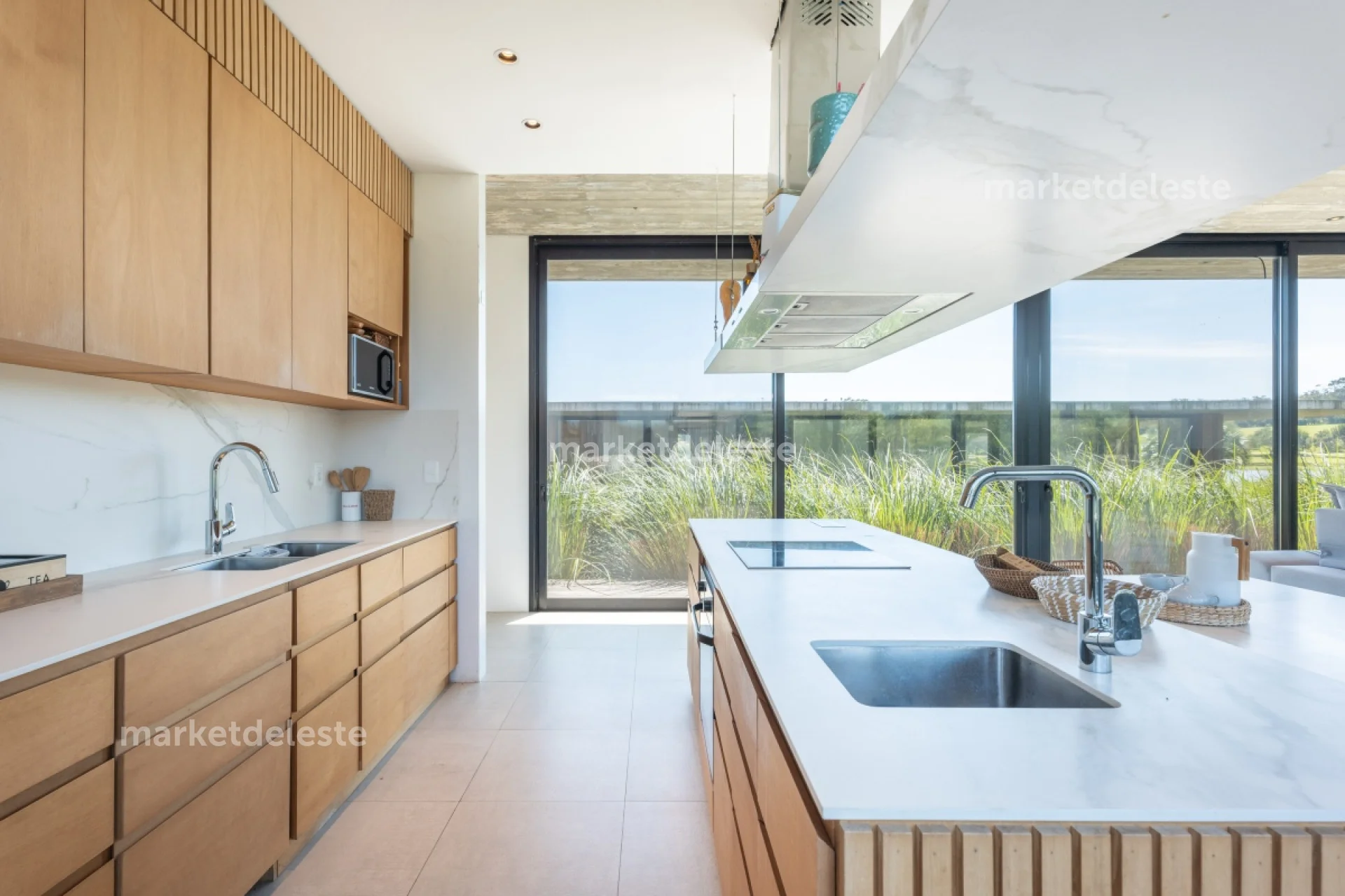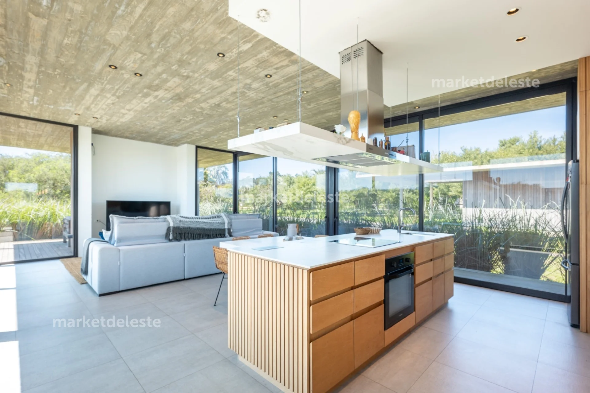 Esta magnifica casa de 4 dormitorios, 5 baños es la definición de lujo y confort. Sumamente luminosa, de amplios ventanales con vistas al verde, lagos y espectaculares arboledas. La casa consta de 2 modulos principales, en el modulo principal se encuentra el living comedor, cocina, comedor diario y toilette, seguido de este bloque, se encuentra el segundo bloque con 3 dormitorios en suite. Separaado casa con dormitorio de huespedes.