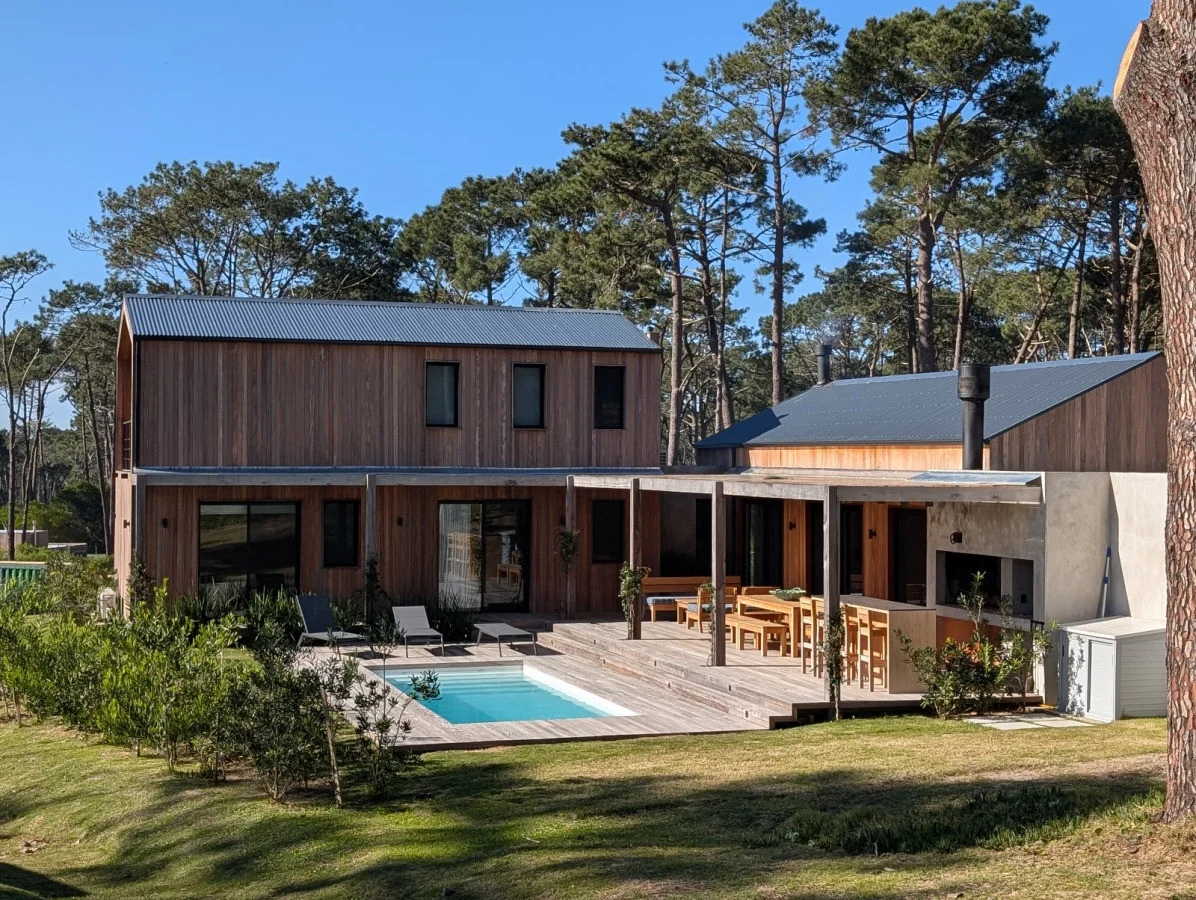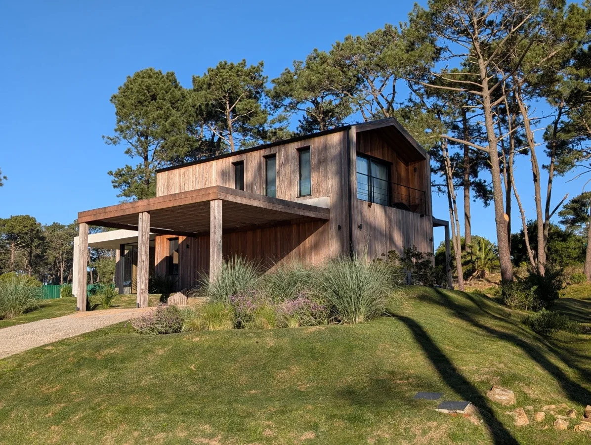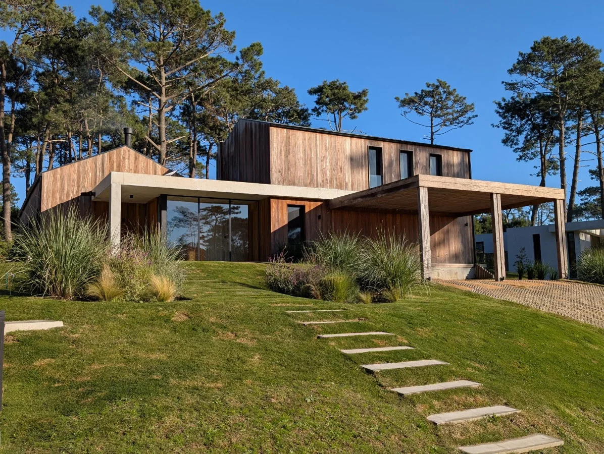 Residencia en Reserva Montoya, La Barra, Punta del Este. Diseño nórdico, revestida en lapacho con amplios espacios exteriores al norte.