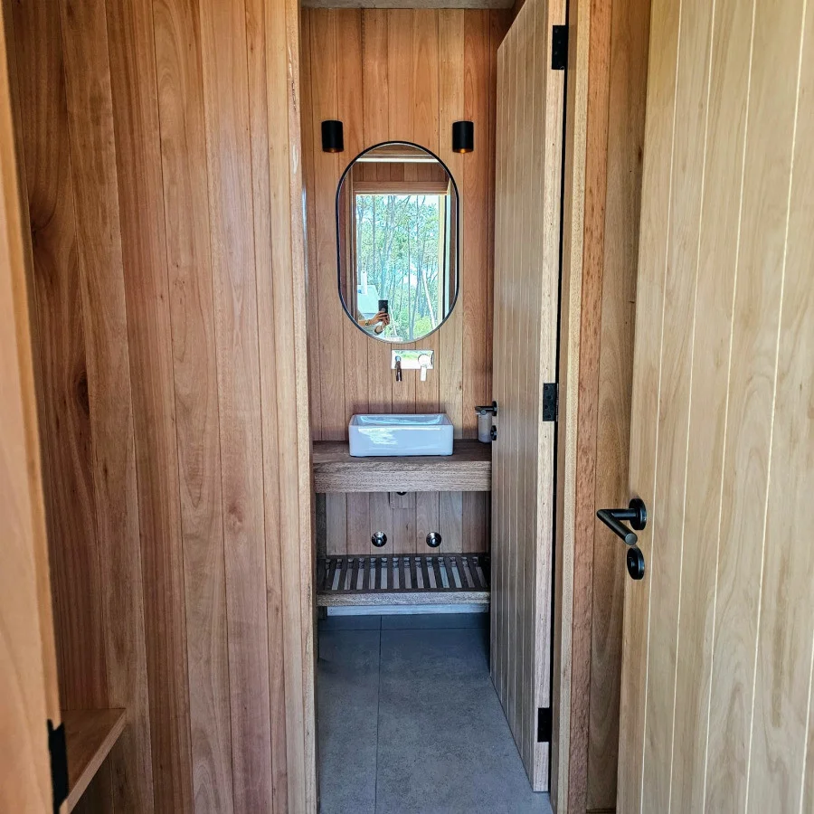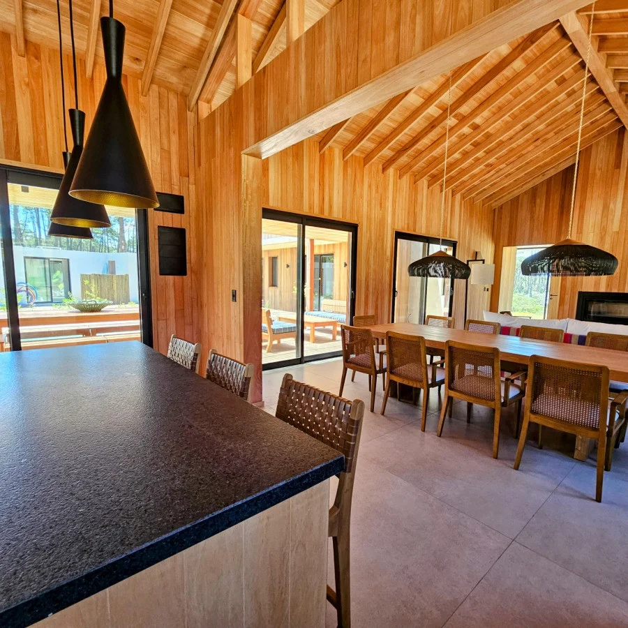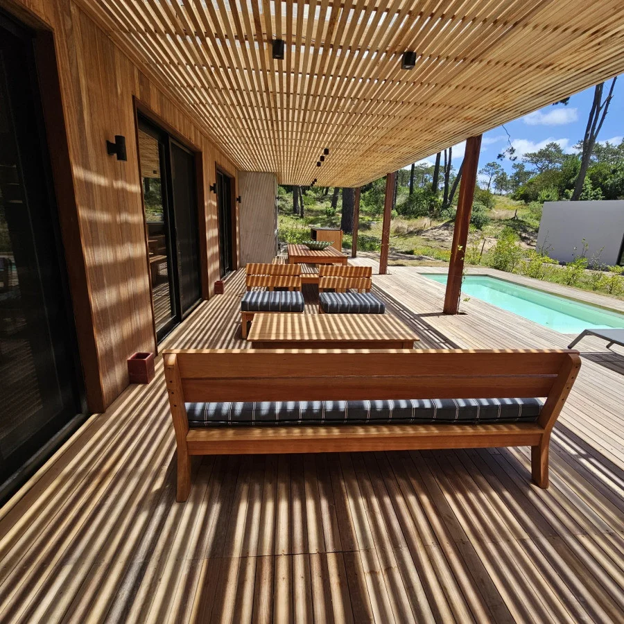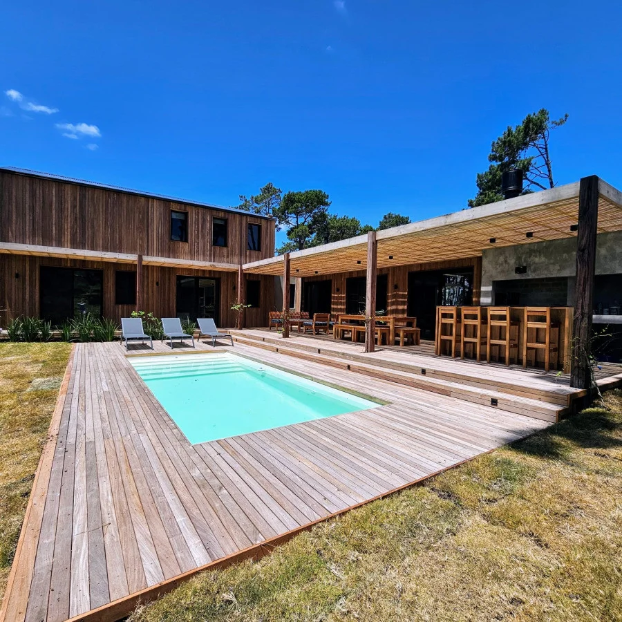 Residencia en Reserva Montoya, La Barra, Punta del Este. Diseño nórdico, revestida en lapacho con amplios espacios exteriores al norte.