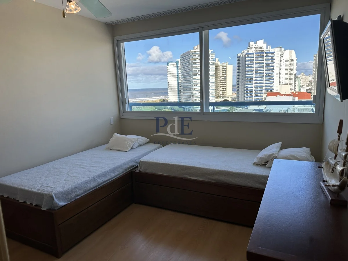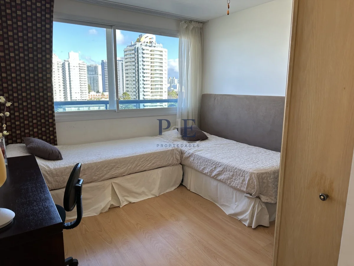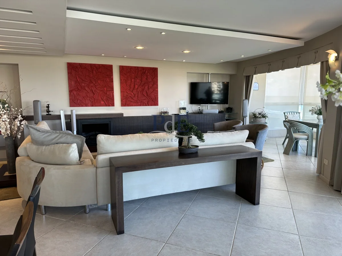 Hermoso apartamento en la zona de Playa Brava, cerca de todo, living-comedor con estufa a leña sistema americano, doble terraza al frente con toda la vista y parrillero propio, toilette, cocina amplia con terraza lavadero y dependencia de servicio con baño, 3 dormitorios en suite. garage