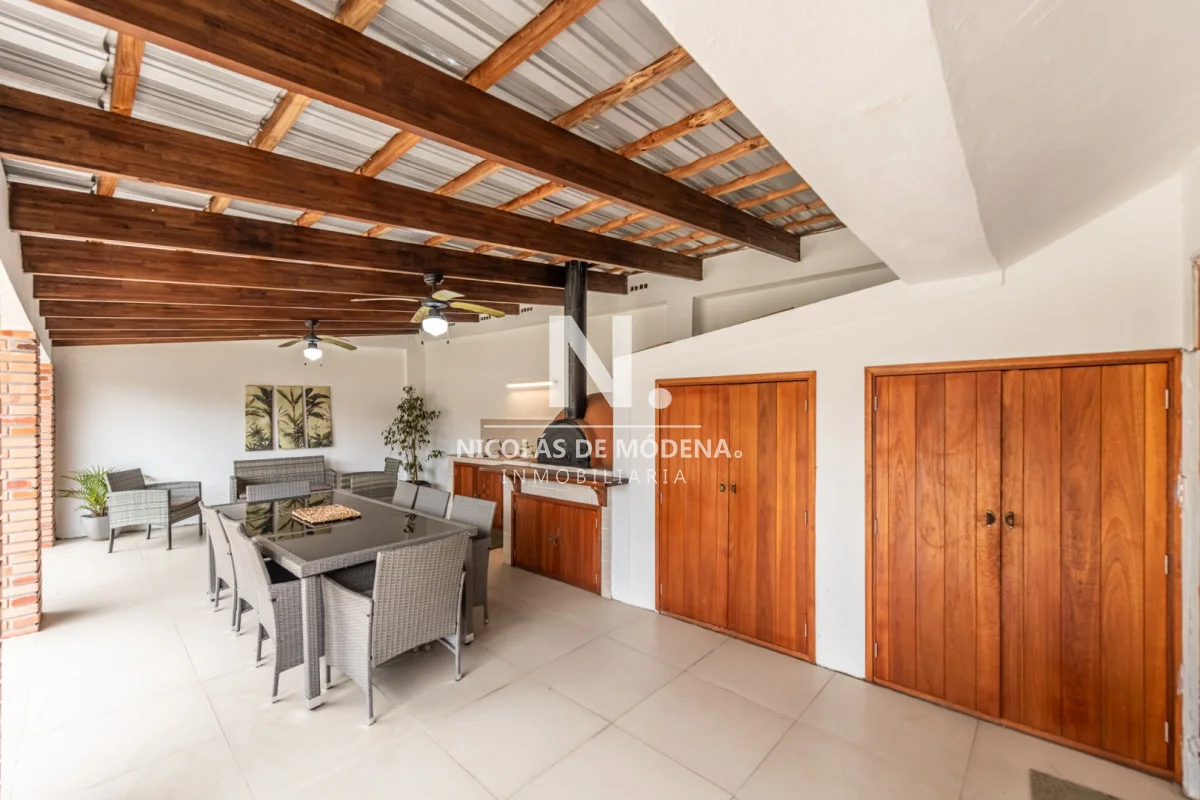 El espacio exterior es uno de los puntos más destacados de la propiedad: un sector de barbacoa muy disfrutable, ideal para reuniones y momentos de descanso, acompañado de una piscina al aire libre, rodeada de un entorno verde que invita a relajarse.