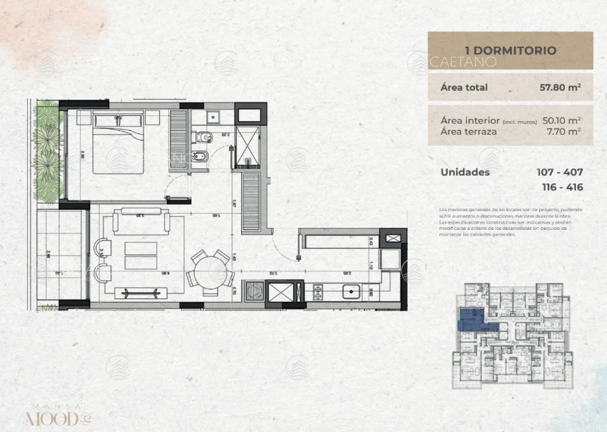 Dos módulos de 4 pisos. Ambas torres tienen la misma orientación y la torre 1 está más sobre la rambla que la torre 2. Unidades monoambientes, 1 dormitorio, 2 dormitorios y 3 dormitorios.
