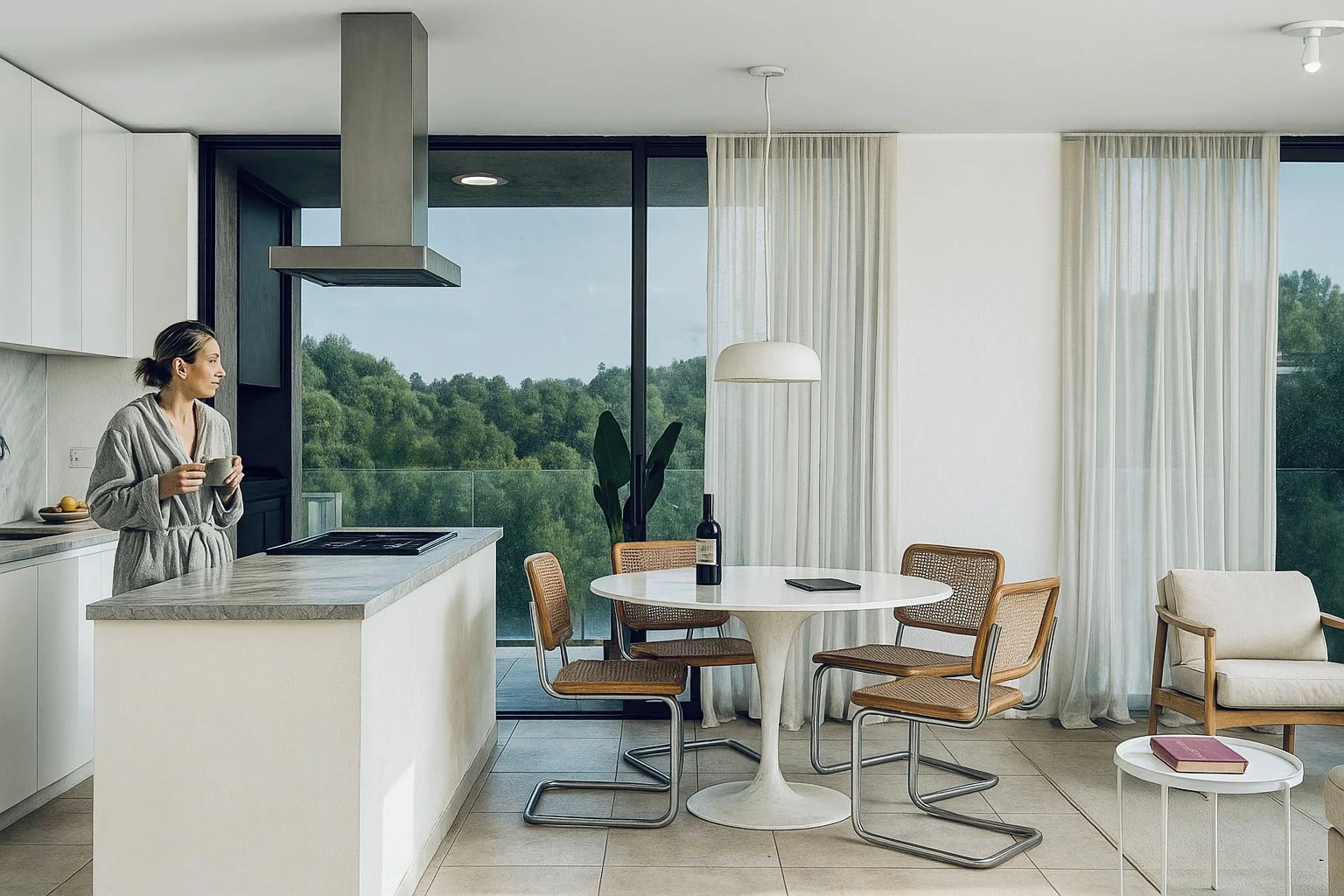 El apartamento cuenta con un amplio living comedor integrado con la cocina, un espacio luminoso y funcional, equipado con aire acondicionado, horno empotrado, anafe y campana. El confort está asegurado durante todo el año gracias a la losa radiante en todos los ambientes.