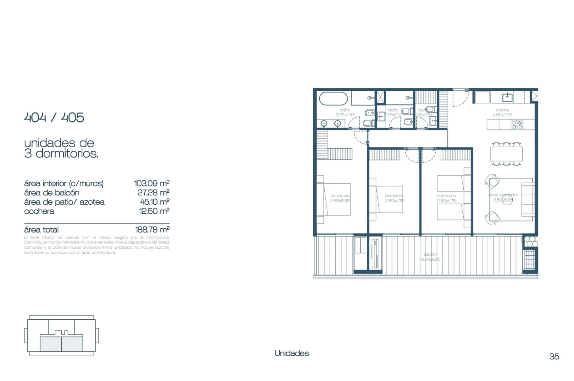 Los tres dormitorios incluyen placares empotrados; el principal incorpora baño en suite y vestidor, ofreciendo mayor privacidad y funcionalidad. Las terminaciones se destacan por pisos de porcelanato y cielorraso de yeso, con la opción de hormigón visto en algunas unidades.