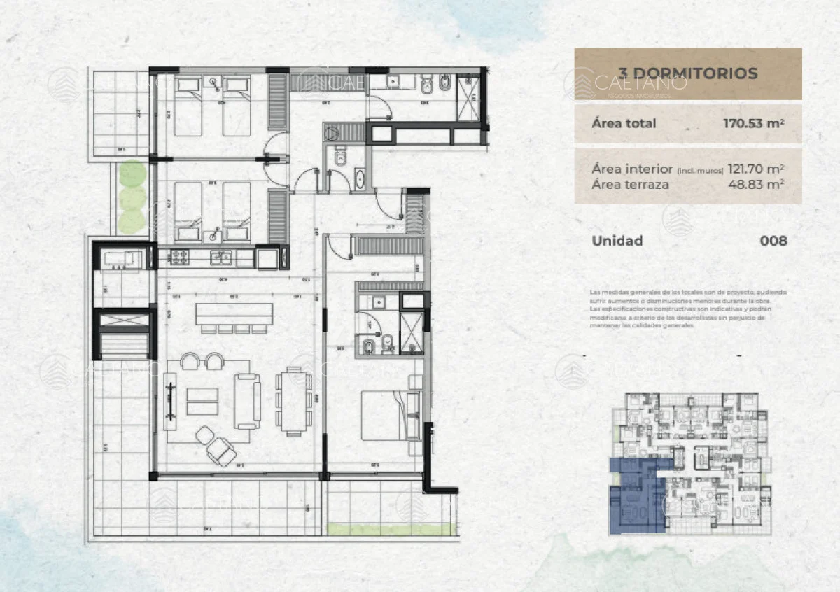 Dos módulos de 4 pisos. Ambas torres tienen la misma orientación y la torre 1 está más sobre la rambla que la torre 2. Unidades monoambientes, 1 dormitorio, 2 dormitorios y 3 dormitorios.