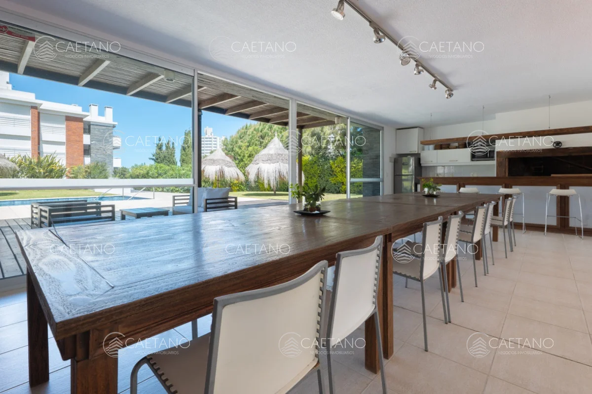 El complejo ofrece servicio de mucamas , piscina climatizada, salón para eventos con parrillero de uso común y vigilancia.