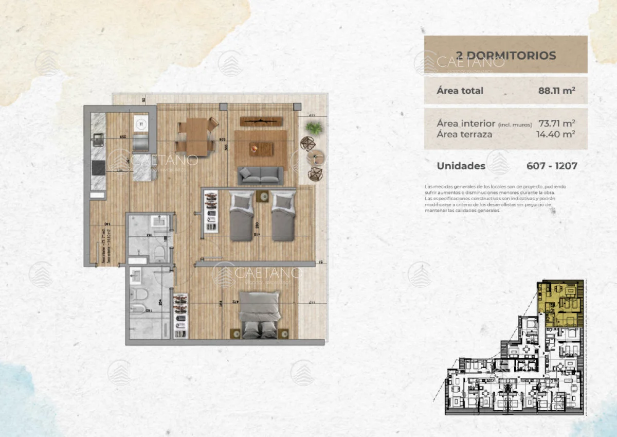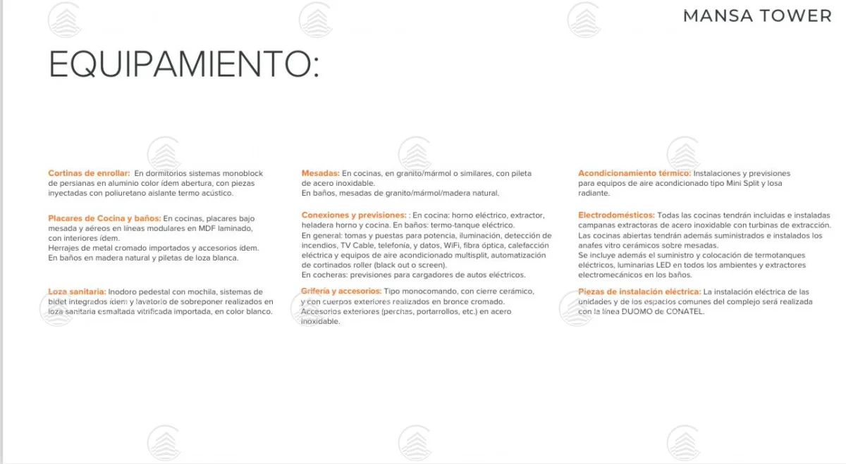 Ofrece una excelente calidad de construcción que incluye, cimentaciones con patinespilotes de hormigón armado altamente resistente, estructura portante compuesta por un conjunto de elementos (pilares, vigas y losas) realizados en hormigón armado, así como terminaciones de calidad y equipamiento con anafes vitrocerámicos, campanas extractoras de aire, termotanques, entre otros, además de previsiones para equipos de aire acondicionado tipo Multi Split y losa radiante.