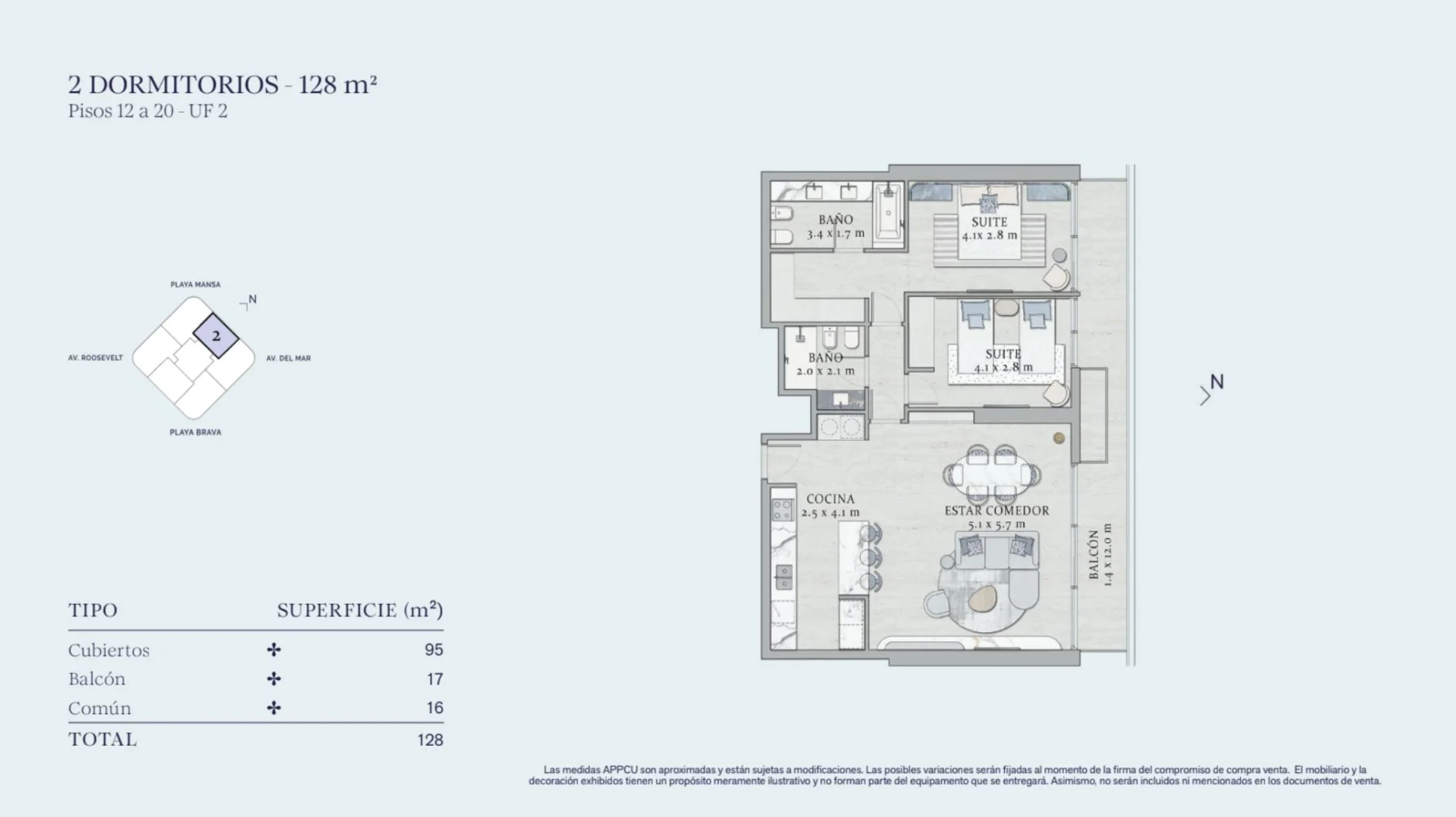La zona íntima está totalmente separada para mayor privacidad. El apartamento cuenta con dos Dormitorios en Suite completos. La Suite principal es generosa en espacio y cuenta con su propio baño completo. La Segunda Suite es igualmente cómoda y funcional, e incluye también su propio baño completo adicional.