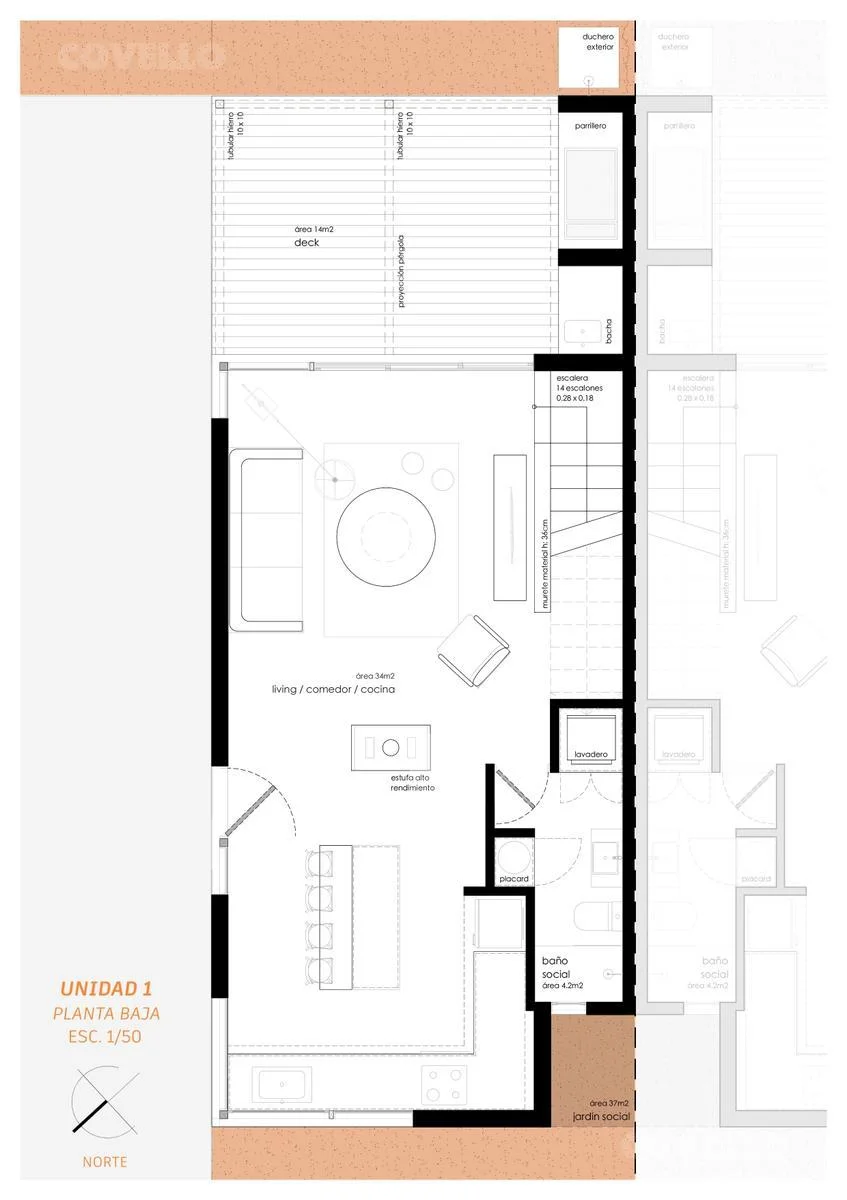 integrando living, cocina y comedor + toilette con ducha y lavadero. Hacia el fondo se extiende un deck con parrillero y pérgola. En PA desarrollamos dos
