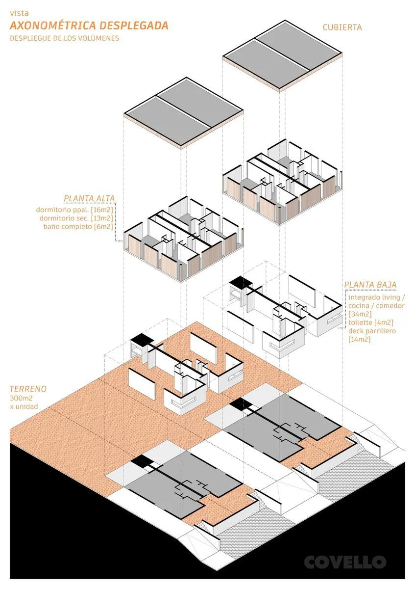 Cada vivienda se desarrolla como DÚPLEX en PH (propiedad horizontal), sobre un terreno de 300m2 para cada