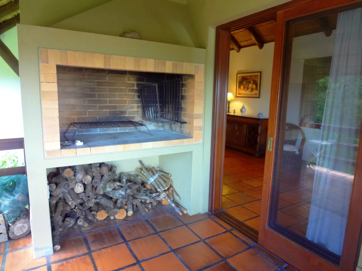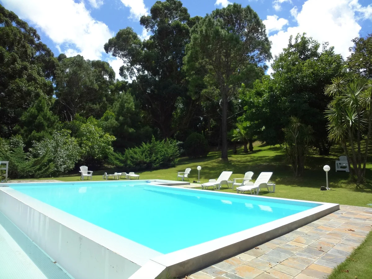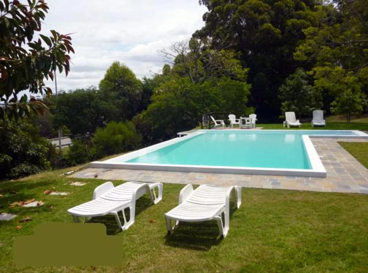 Piscina con deck y duchero exterior, parrillero, estufa a leña.