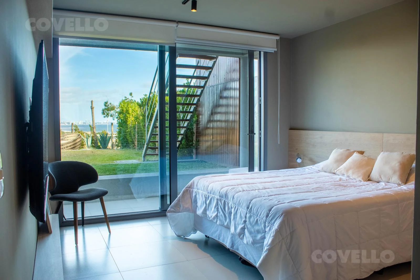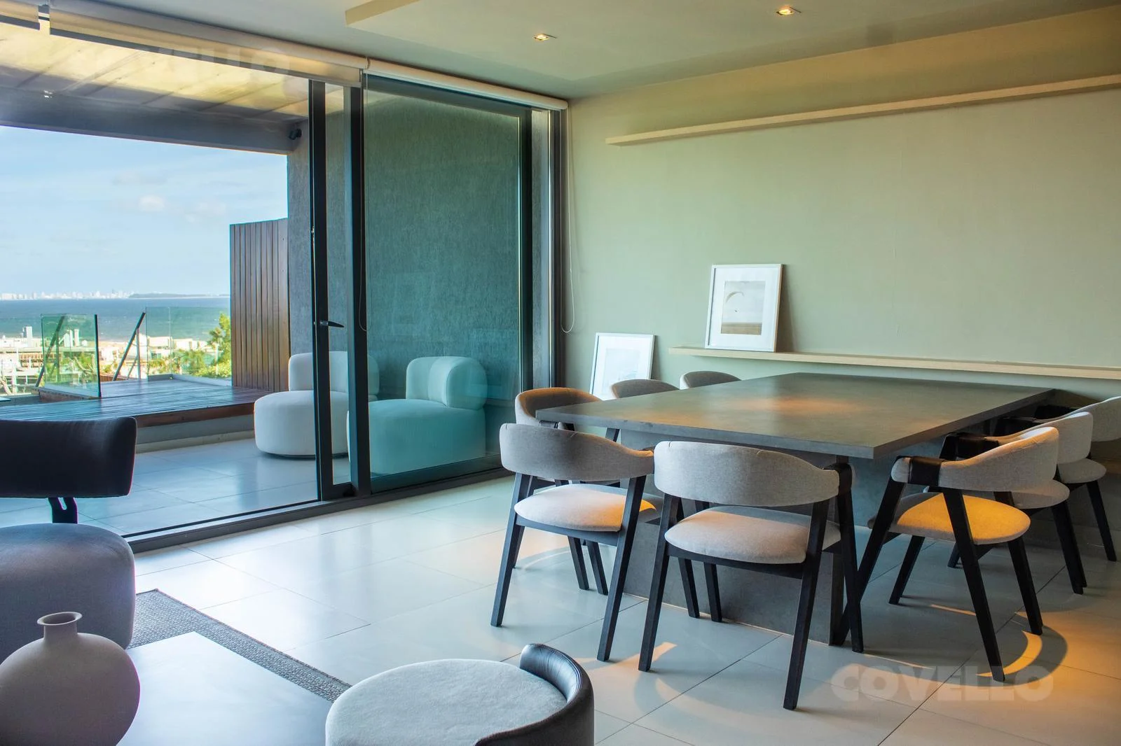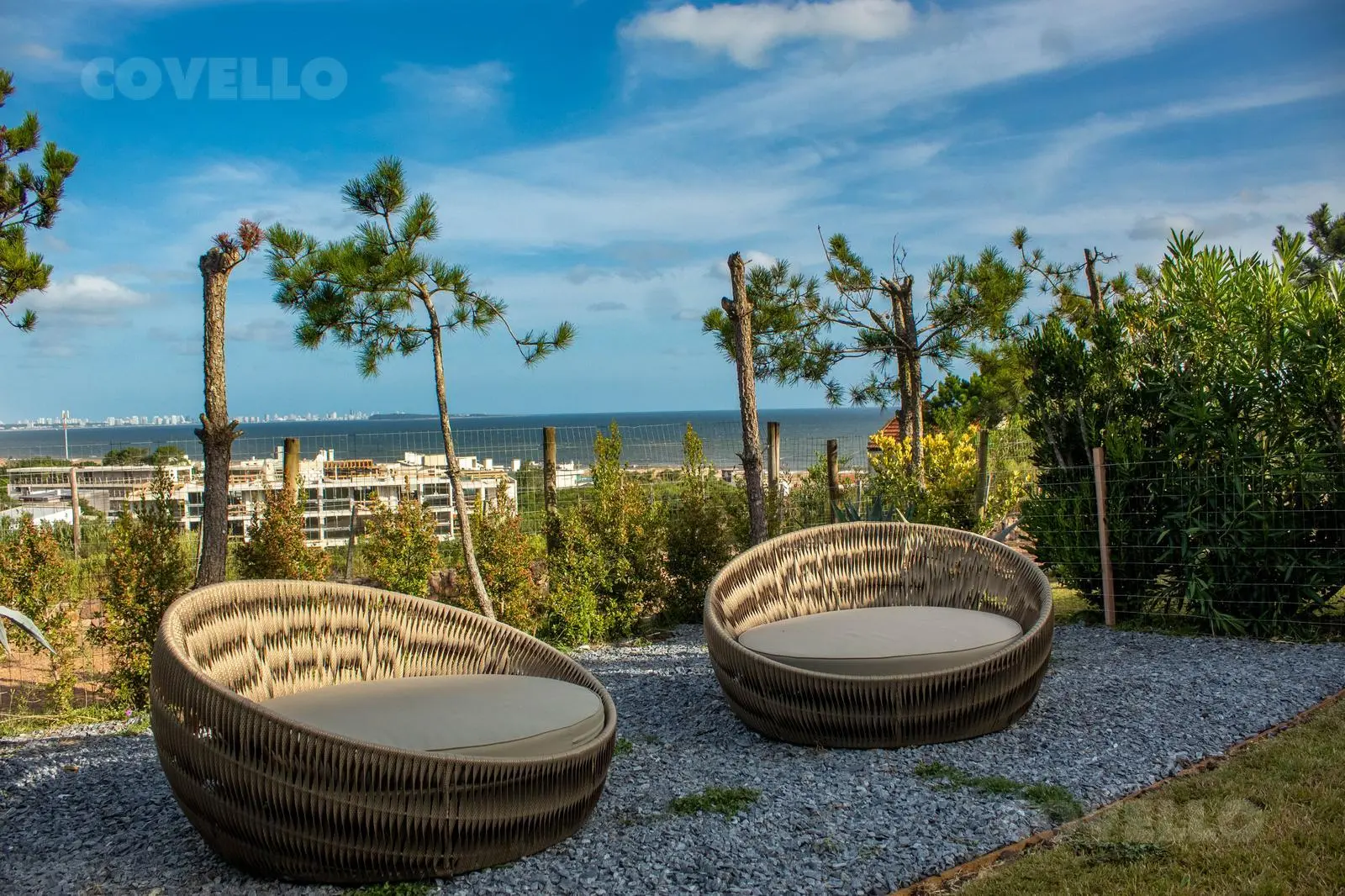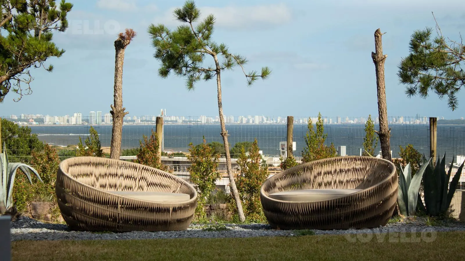 En planta alta cuenta con living comedor, cocina integrada, toilette y amplia terraza con excepcional vista al mar y a la Bahía de Punta del Este. Salida directa al jardin.