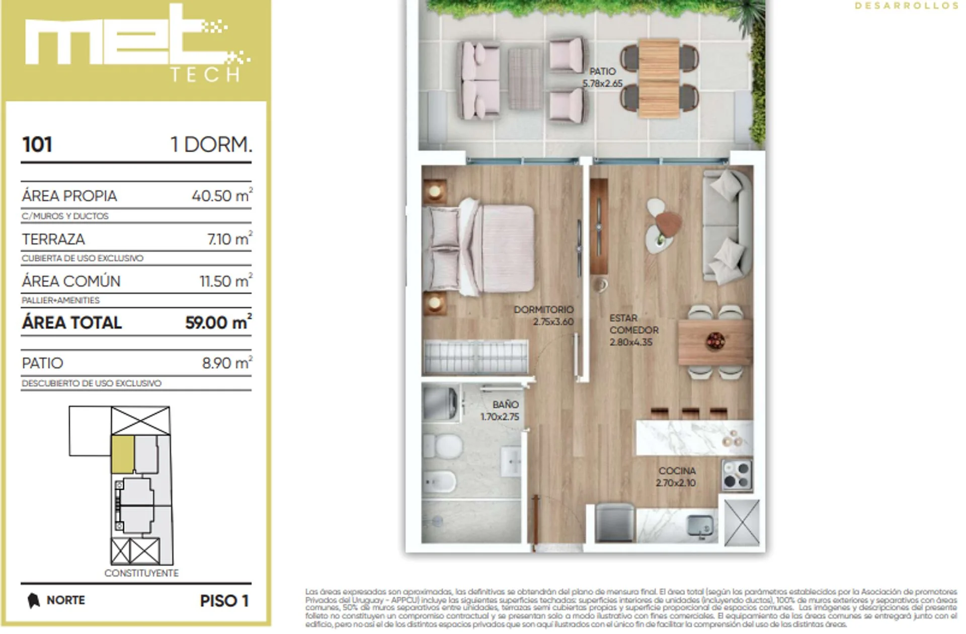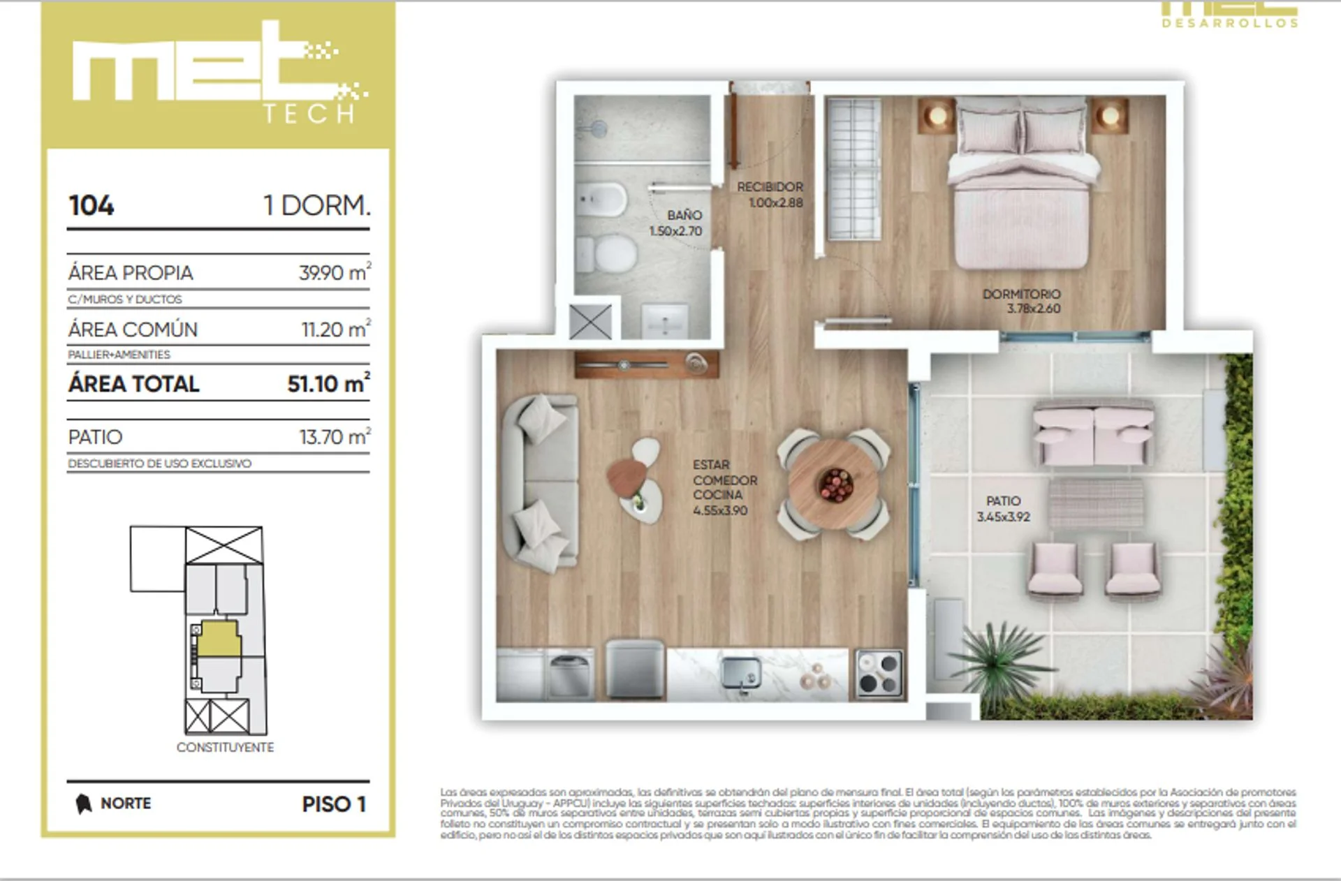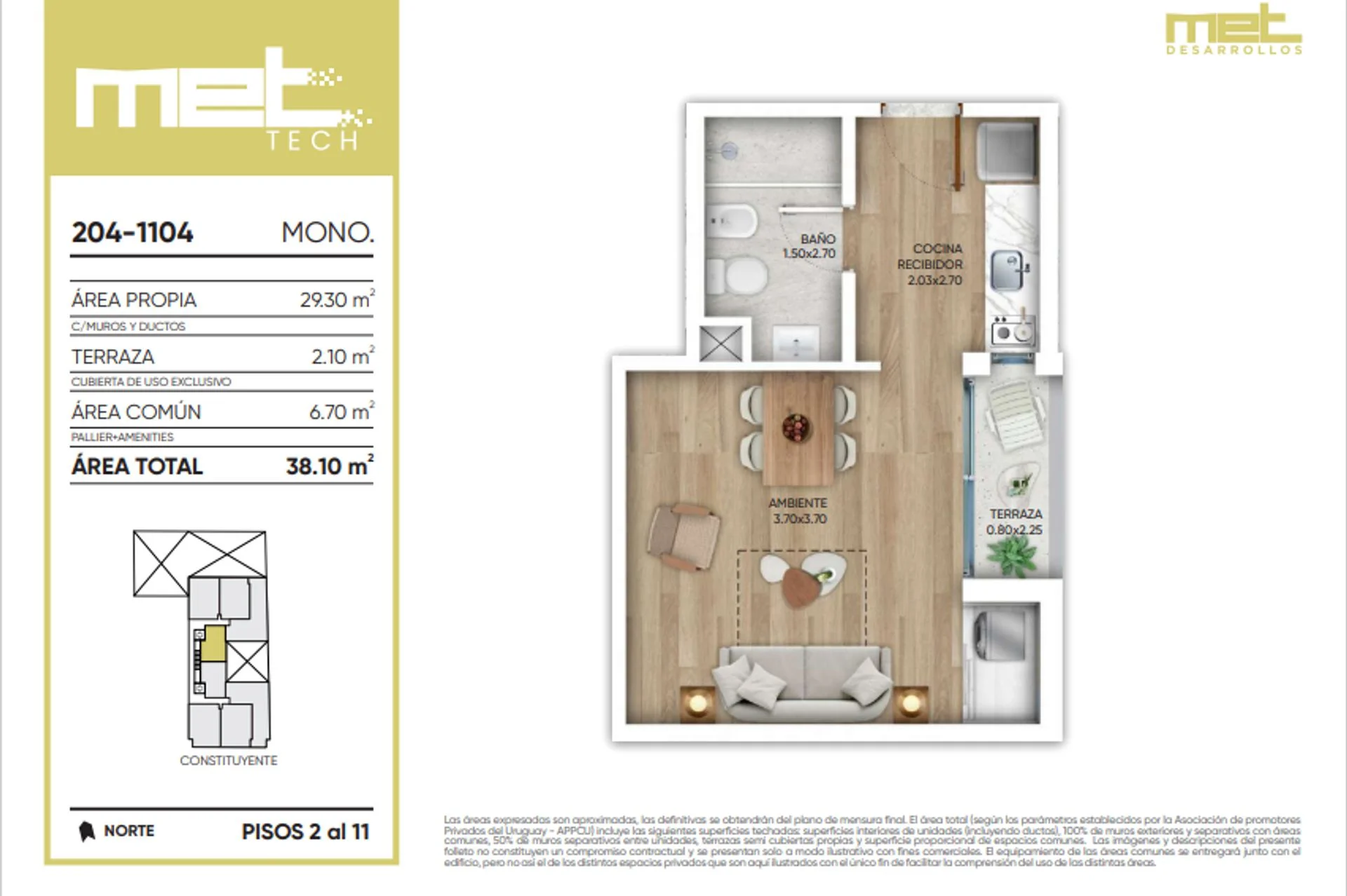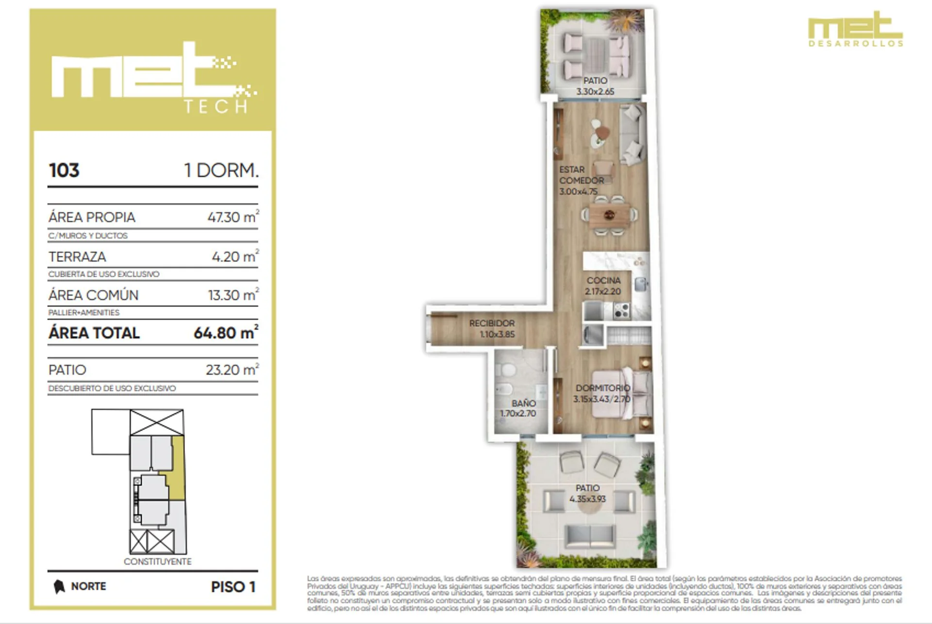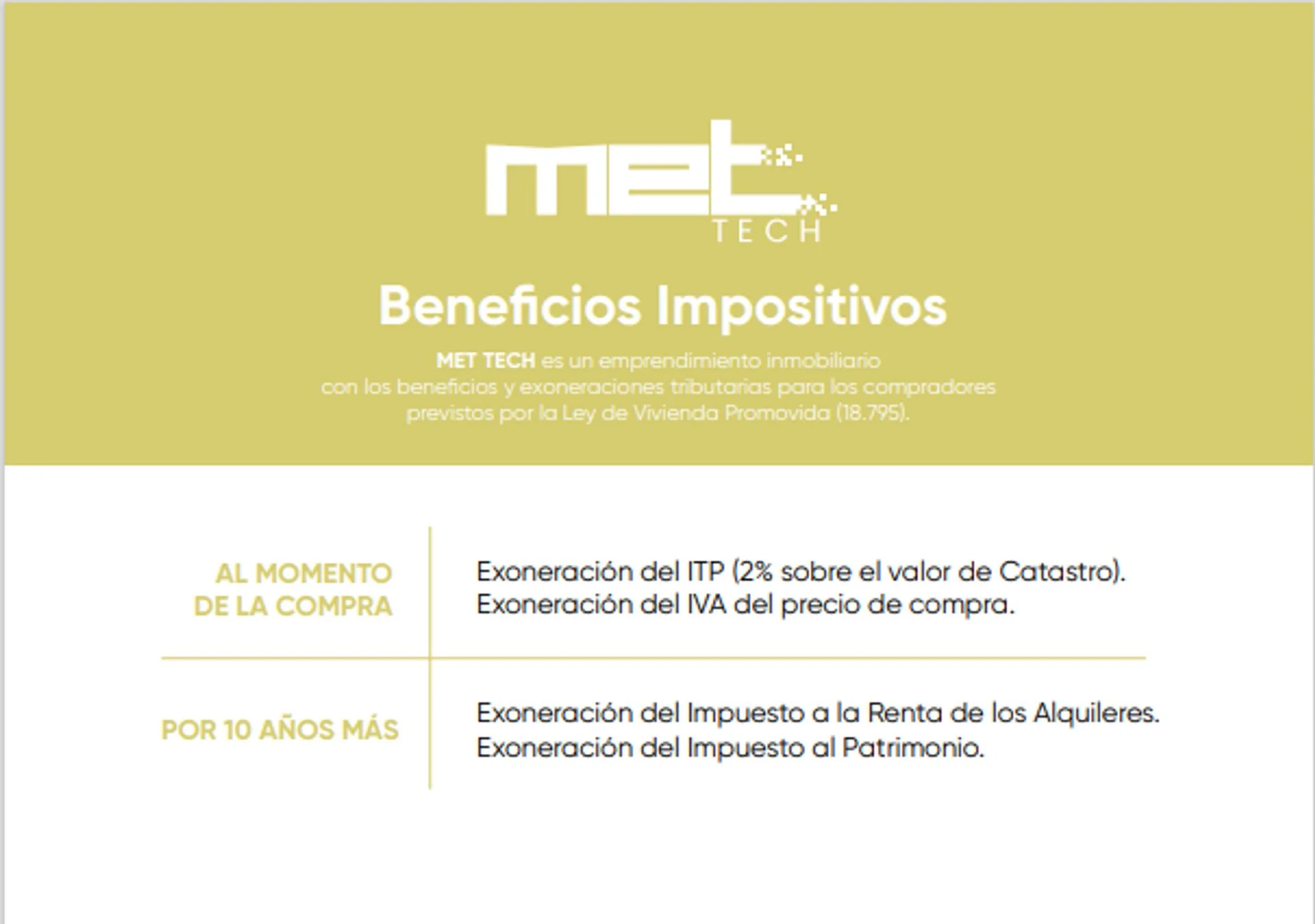 Corredor Responsable: - Contacto: Maria Laura Scoseria Excelente oportunidad de inversión! * Comenzar a pagar un bien mientras se construye, permite comprar a menor precio! * Exoneraciones por vivienda promovida: ITP 2%; no paga IVA al precio de compra. * Contar con una empresa como Met Tech, que es garantía en la construcción de calidad y con experiencia, en el país utilizando toda la tecnología de la vida moderna de estos tiempos. Ubicamos el proyecto en la zona de Cordón, barrio con un encanto especial por su historia y su rápido proceso de reconversión. Sobre la calle Constituyente, entre Magallanes y Gaboto. La zona más buscada por su cercanía a Facultades, a la Rambla, al Parque Rodó, al Centro,a Tres Cruces y a Punta Carretas. El proyecto: Es una torre de 13 pisos con un total de 93 apartamentos Studio, 1 y 2 dormitorios todos con terrazas o patios. También Monoambientes. El edificio incorpora una serie de novedades tecnológicas que te permitirán disfrutar de los beneficios y el confort de la vida moderna, como la Domótica y el acceso digital a las unidades. En subsuelo y planta baja se distribuirán 47 cocheras, espacios para carga de autos electricos y area de bike parking. En el primer piso se encontrarán distintos amenities como, microcine, cowork, laundry, gimnasio equipado, gimnasio exterior y jardin. Y en el último piso se dispondrá de una barbacoa cerrada con parrillero, barbacoa exterior y parrillero al aire libre, solarium con piscina. Para mayor seguridad el edificio contará con cámaras de seguridad y acceso al edificio con reconocimiento facial. El garaje es opcional (no viene incluido en el precio). En este momento tenemos desde U$S 18,453. Gastos comunes son: los monoambientes $ 3.500; un 1 dormitorio $ 4.500; 2 dormitorios $ 5.800 Los gastos de ocupación son del 4%, estos incluyen gastos de conexión, alhajamiento de espacios comunes, reglamento de co-propiedad y plano de mesura. La fecha de estreno del proyecto se prevé para septiembre de 2025. Cada Oficina es de propiedad, gestión y desarrollo independiente La presente publicación describe las características esenciales del inmueble, debiéndose consultar al responsable de la operación por la eventual actualización de las medidas, descripciones arquitectónicas y funcionales, servicios, impuestos, precios y demás información, cuyos valores son aproximados.