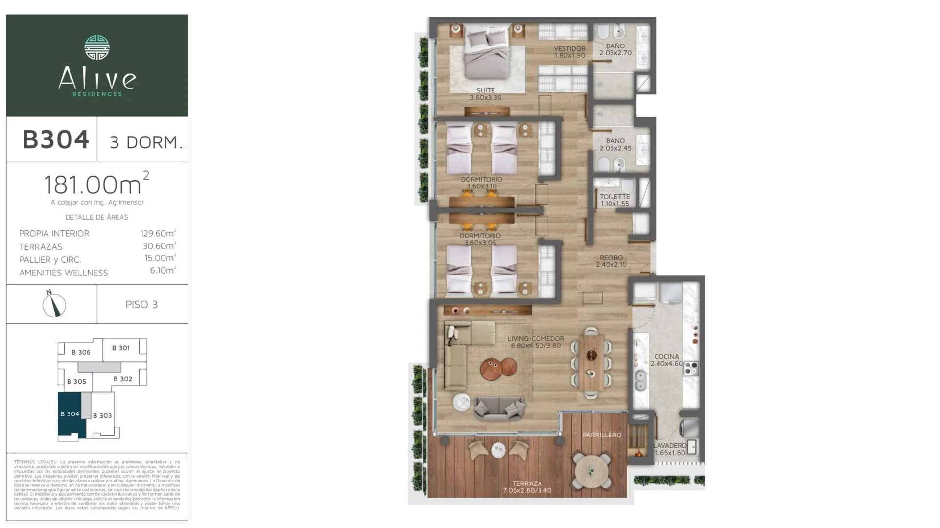 Corredor Responsable: - Contacto: Bettina Sommer Alquila apartamento totalmente equipado en Alive Spa Residences en el Barrio Parques 2. Edificio de lujo con los mejores amenities de Montevideo. La unidad se encuentra en el segundo piso del edificio Alive Se ingresa a un living comedor con salida a terraza con parrillero. - Cocina. - Lavadero. - Toilette. - Master suite. - Segundo y tercer dormitorio. - Baño completo. El precio de alquiler incluye 2 Garaje y Baulera Todos los servicios del complejo están disponibles para los inquilinos Las fotos son de showroom Un Spa a tu disposición para disfrutarlo todos los días. Disfrutá de las mejores prestaciones para tu bienestar en el mismo lugar donde vivís. Piscina interior de 8 x 8 mts. Hidromasaje de 4.30 x 5 mts. Circuito de hidroterapia terapéutico. Sala de masajes. Sauna seco. Sala de gimnasia, estiramiento y meditación. Sala de relax. Sala de estar. Sala de juegos. 2 barbacoas completas equipadas para 20 servicios cada una. Gimnasio de vanguardia. Vestuarios masculinos y femeninos. Sala de reuniones. Consultorio médico. Además podrás disfrutar de diversas rutinas de entrenamiento. diseñadas especialmente en base a las necesidades de cada propietario o inquilino, incluyendo caminatas al aire libre, variadas clases de entrenamiento físico, yoga, hidrogym y aquaspinning. El bienestar emocional también tendrá su espacio con sesiones de meditación guiada, masajes y demás programas para disfrutar de una vida plena. La seguridad es uno de los puntos más fuertes de esta importante zona de barrios privados, que se vienen desarrollando en total armonía con la naturaleza. Un lugar que permite disfrutar la serenidad y la paz del día a día y a su vez estar en contacto muy estrecho con los puntos más importantes de la ciudad. Cada Oficina es de propiedad, gestión y desarrollo independiente La presente publicación describe las características esenciales del inmueble, debiéndose consultar al responsable de la operación por la eventual actualización de las medidas, descripciones arquitectónicas y funcionales, servicios, impuestos, precios y demás información, cuyos valores son aproximados.