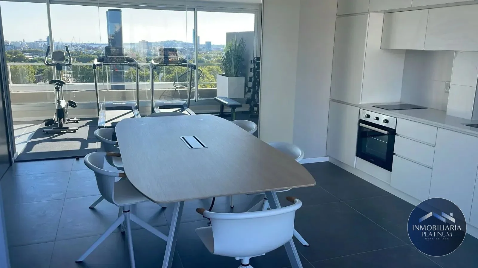 Salón de Usos Múltiples y Co-working: Un ambiente luminoso y amplio que incluye una gran mesa central y una cocina moderna integrada. Es el entorno ideal tanto para hacer home office como para recibir invitados.