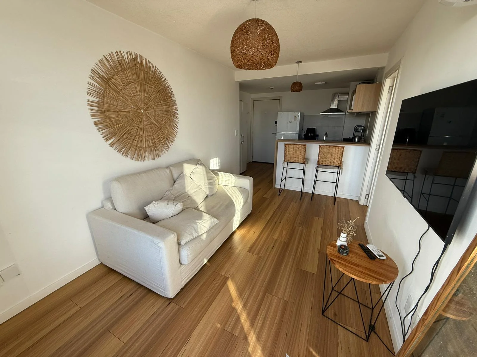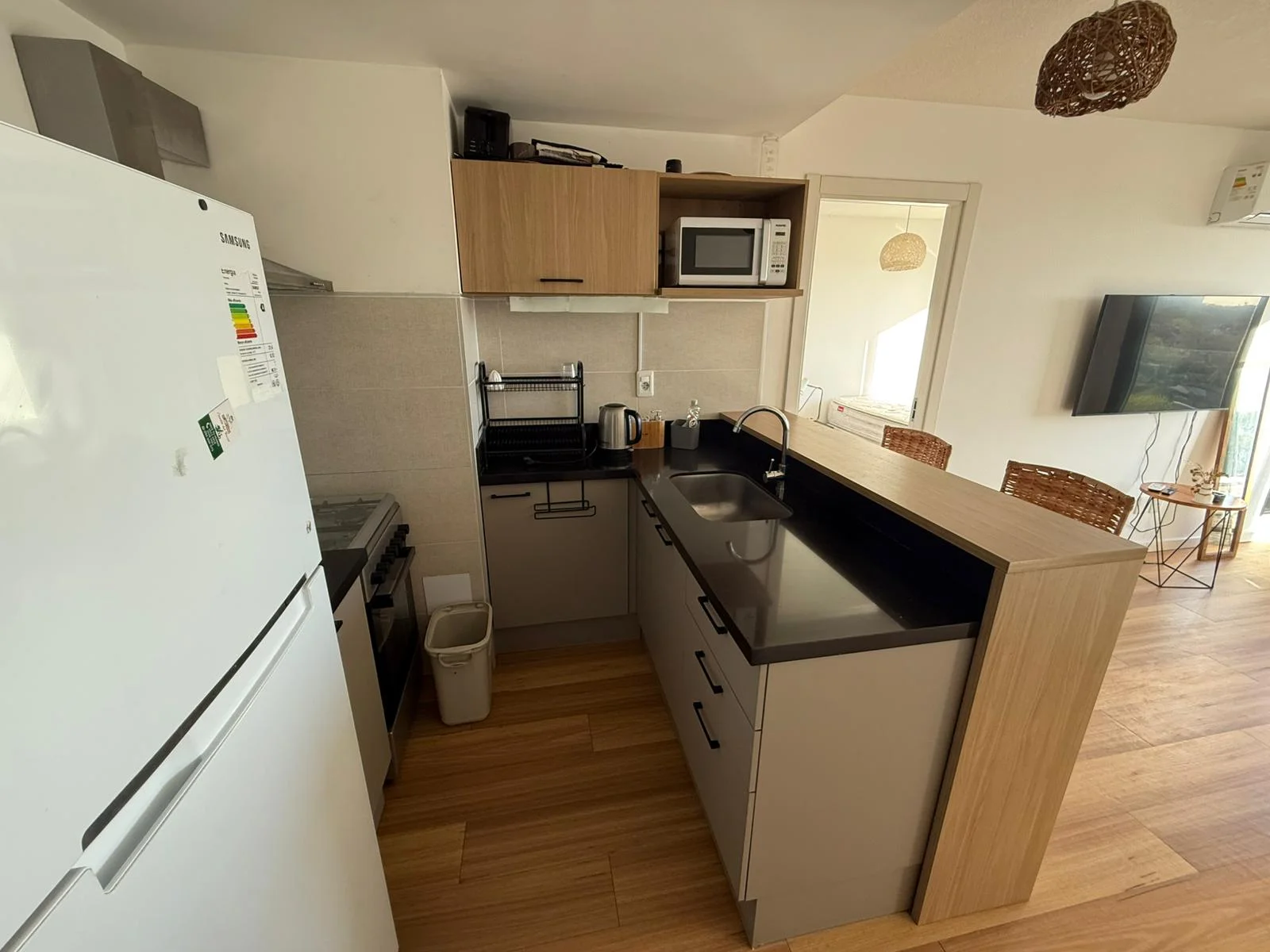 Living comedor con cocina integrada con muebles sobre y bajo mesada.