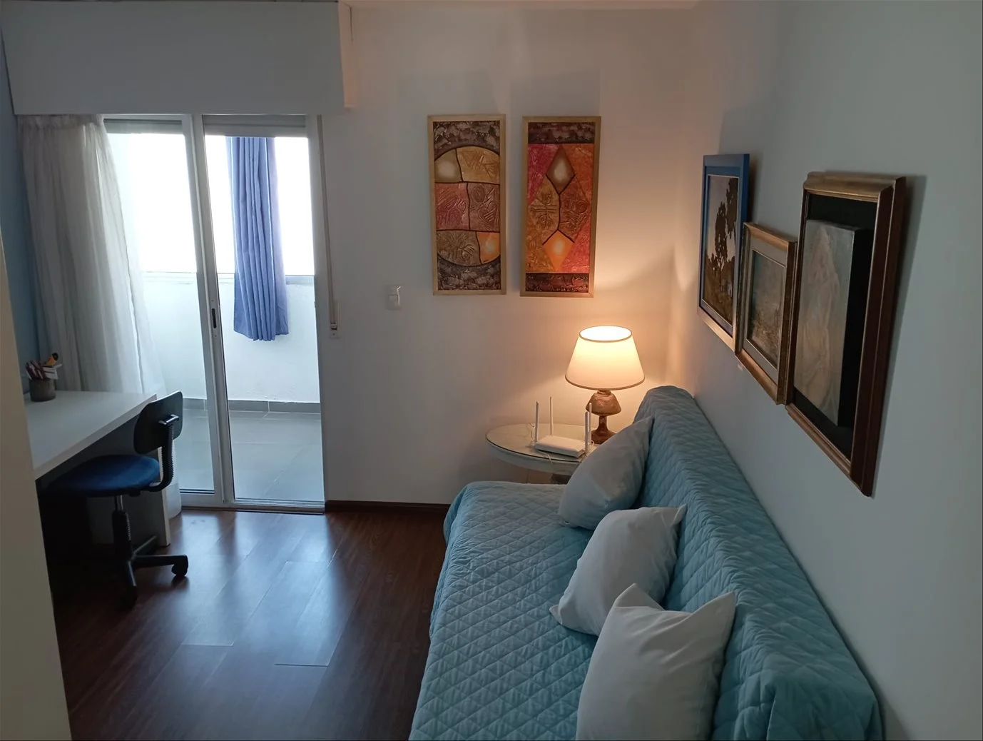 Segundo dormitorio cuenta con una cama con colchón, ropero, mesa de luz y escritorio, con terraza incluida.