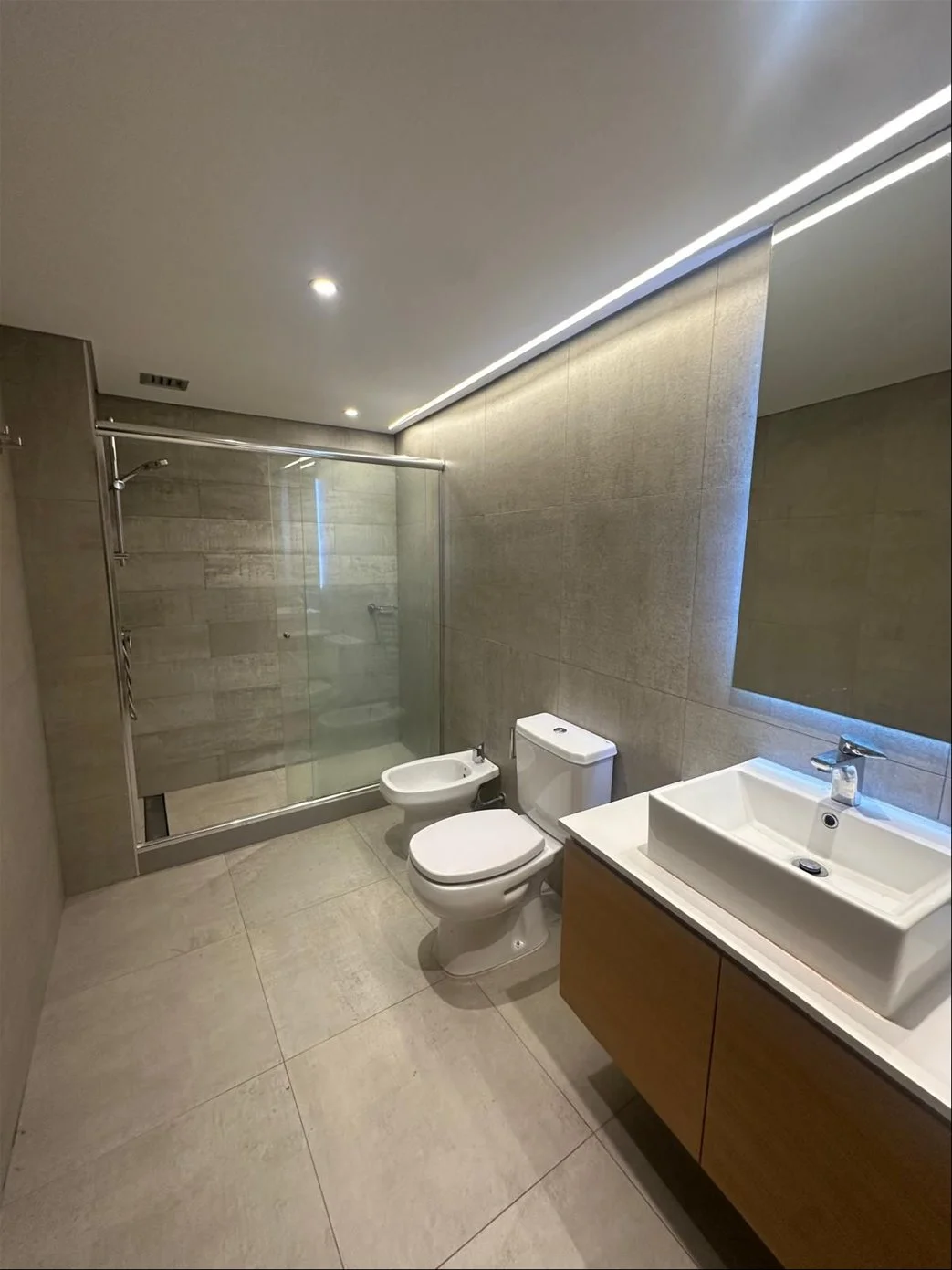 Baño completo muy cómodo y moderno con placard, mampara de cristal, espejo y calefón.