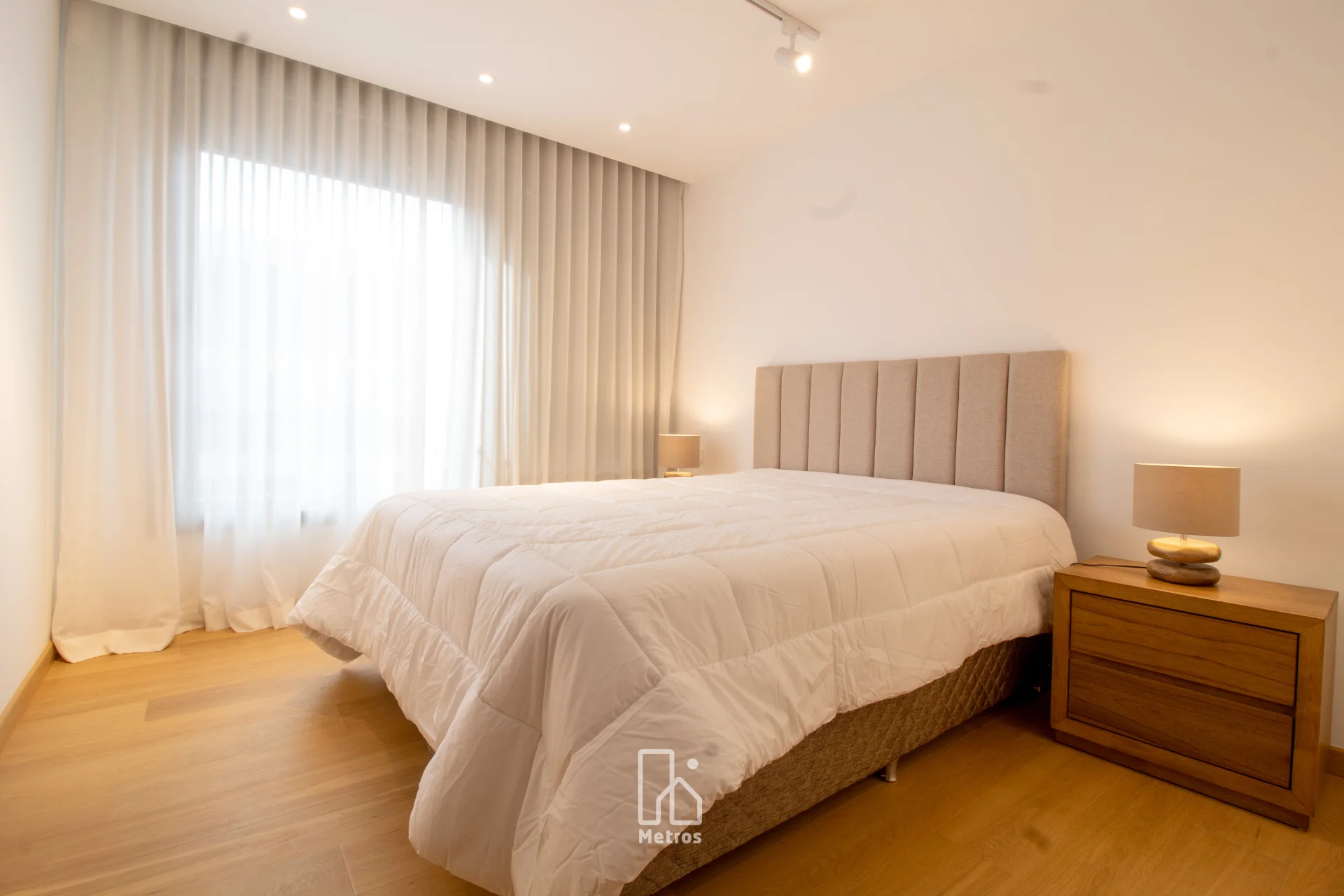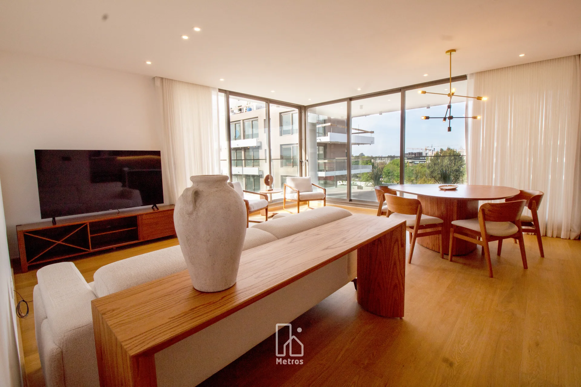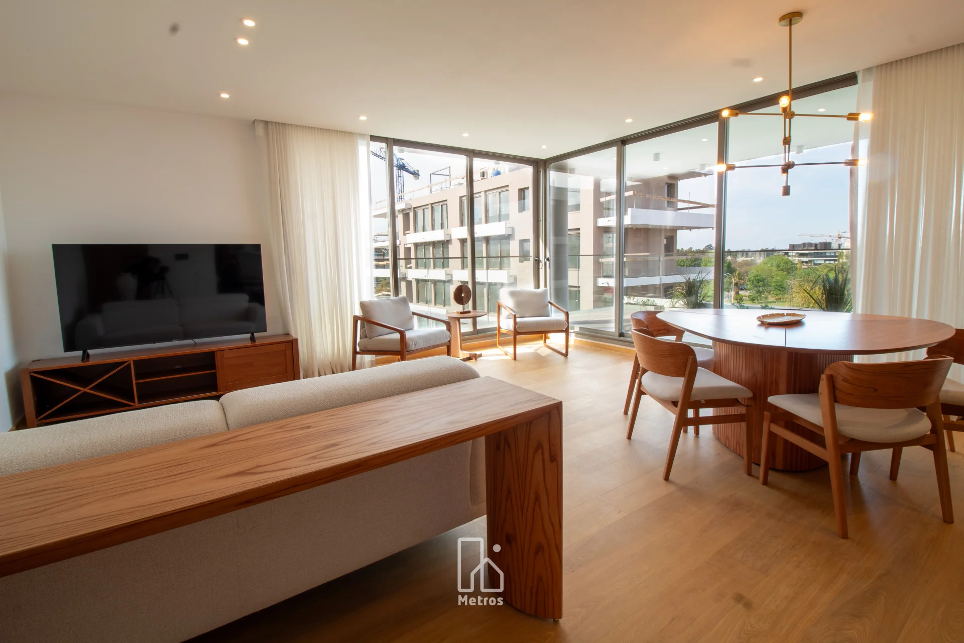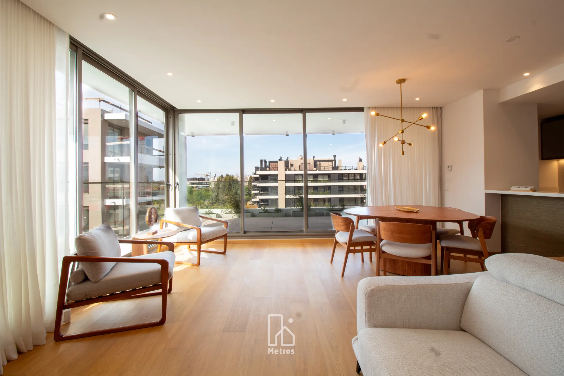 DESTACAMOS Proyecto único en Latinoamérica • A estrenar • Gran terraza al norte + Parrillero • Orientación Norte • Excelentes amenities • Barrio con seguridad EL BARRIO El complejo se ubica en uno de los barrios semi cerrados más exclusivos de Montevideo: Barrio Parques, en Carrasco Norte, rodeado de buen paisaje y tranquilidad. Viví tranquilo con la seguridad que el complejo te ofrece. Cuenta con vigilancia las 24 horas del día, para que tus chicos puedan disfrutar en todo momento. Ubicado a 30 min del centro de Montevideo, a 5min de los Colegios más importantes de la capital, a 10 del Aeropuerto de Carrasco y a 10min del Centro de Carrasco. EL EDIFICIO - AR Proyecto único en Latinoamérica, primer complejo wellness de la región orientado íntegramente al bienestar. Combina residencias de alta gama con un SPA de 650 m² y una completa propuesta de servicios para el cuidado físico, mental y emocional. Piscina interior, hidromasaje, sauna, gimnasio de última generación, salas de meditación y masajes, junto a rutinas personalizadas como yoga, aquaspinning y caminatas al aire libre. Todo en un entorno natural de 5.900 m², con materiales sustentables y tecnología aplicada al confort AMBIENTES 2 dormitorios • Terraza + Parrillero • Gran Living comedor • Cocina semi definida • 2 baños • Lavadero • Cochera • Box EL APARTAMENTO Ubicado en piso 3. El apartamento cuenta con 107m2 interiores + 23m2 de terraza. El ingreso al apartamento se da por un hall hacia el living comedor, el cual es muy iluminado ya que cuenta con grandes ventanales en L hacia la terraza, con orientación al norte, ¡la mejor iluminación natural durante todo el día! La terraza es amplia, cuenta con parrillero y espacio para muebles de exterior. La cocina es definida con bajomesada y aéreos de melamínico. Cuenta con 2 dormitorios, el principal en suite. Todos cuentan con placares de melamínico y cortinas de enrollar en las aberturas, ¡todos con orientación al norte! Se destaca por sus terminaciones de gran calidad, toda mampostería tradicional, incluso en las divisiones internas. Cuenta con aberturas DVH y calefacción por losa radiante, además de aire acondicionado en todos los ambientes. Cuenta además con Mampara y espejo en los baños, Cortinas en todo el apartamento, Campana, Horno, Anafe y Luminarias. El precio de alquiler incluye Garaje y Baulera PRECIOS Y GASTOS Gastos comunes estimados: $20.000 Comisión inmobiliaria: 1 mes alquiler + iva ¡Te deseamos suerte en tu búsqueda, y estamos para ayudarte tanto con esta propiedad o también para ayudarte buscando otras opciones en todo el mercado! No dudes en contactarnos. Inmobiliaria Metros Consulta nuestra web y redes sociales para encontrar otras oportunidades