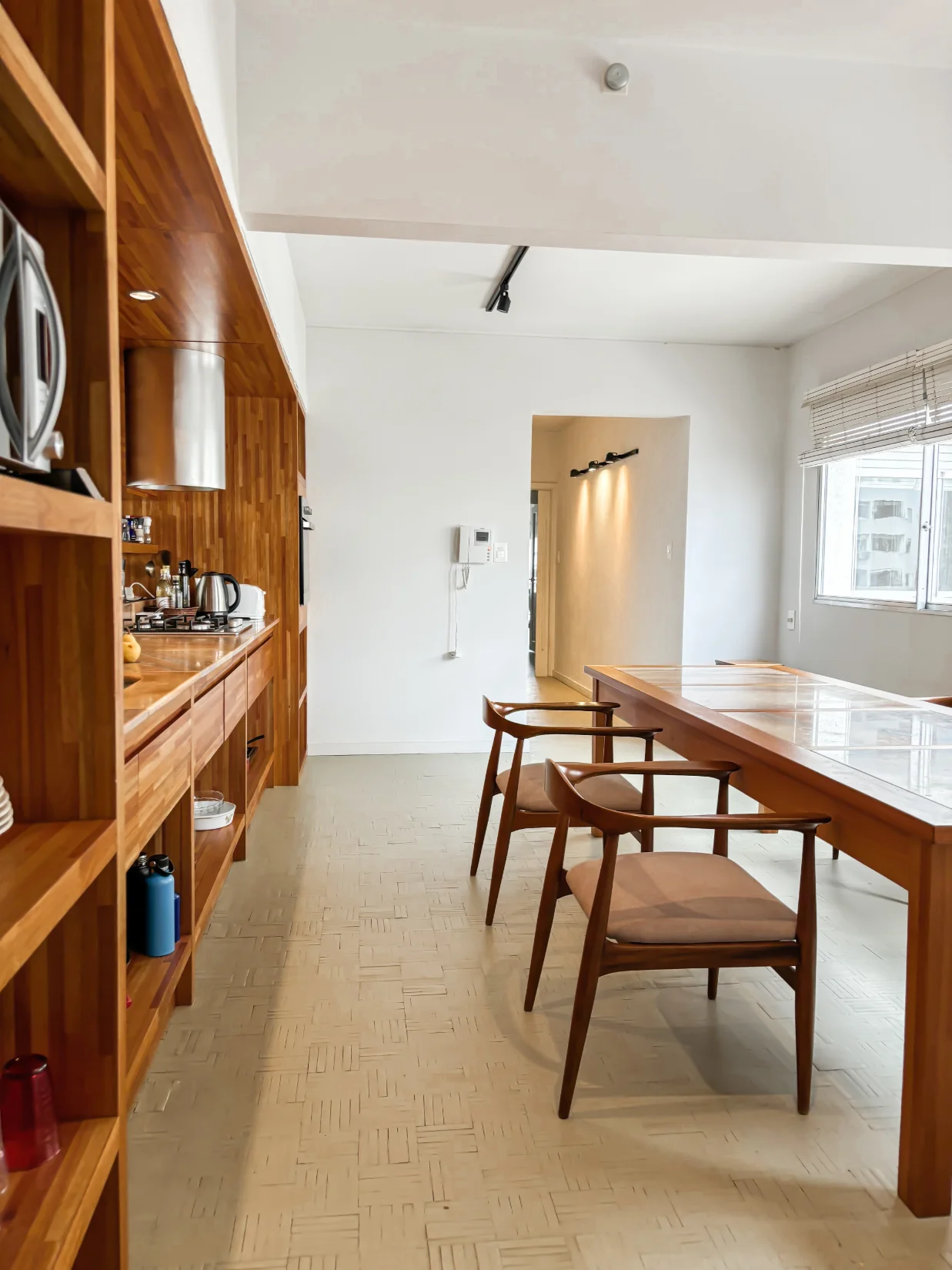 La cocina comedor está situada en el ala opuesta. Igual que todo el apartamento, fue completamente reciclada con un enfoque especial en el diseño y el estilo.