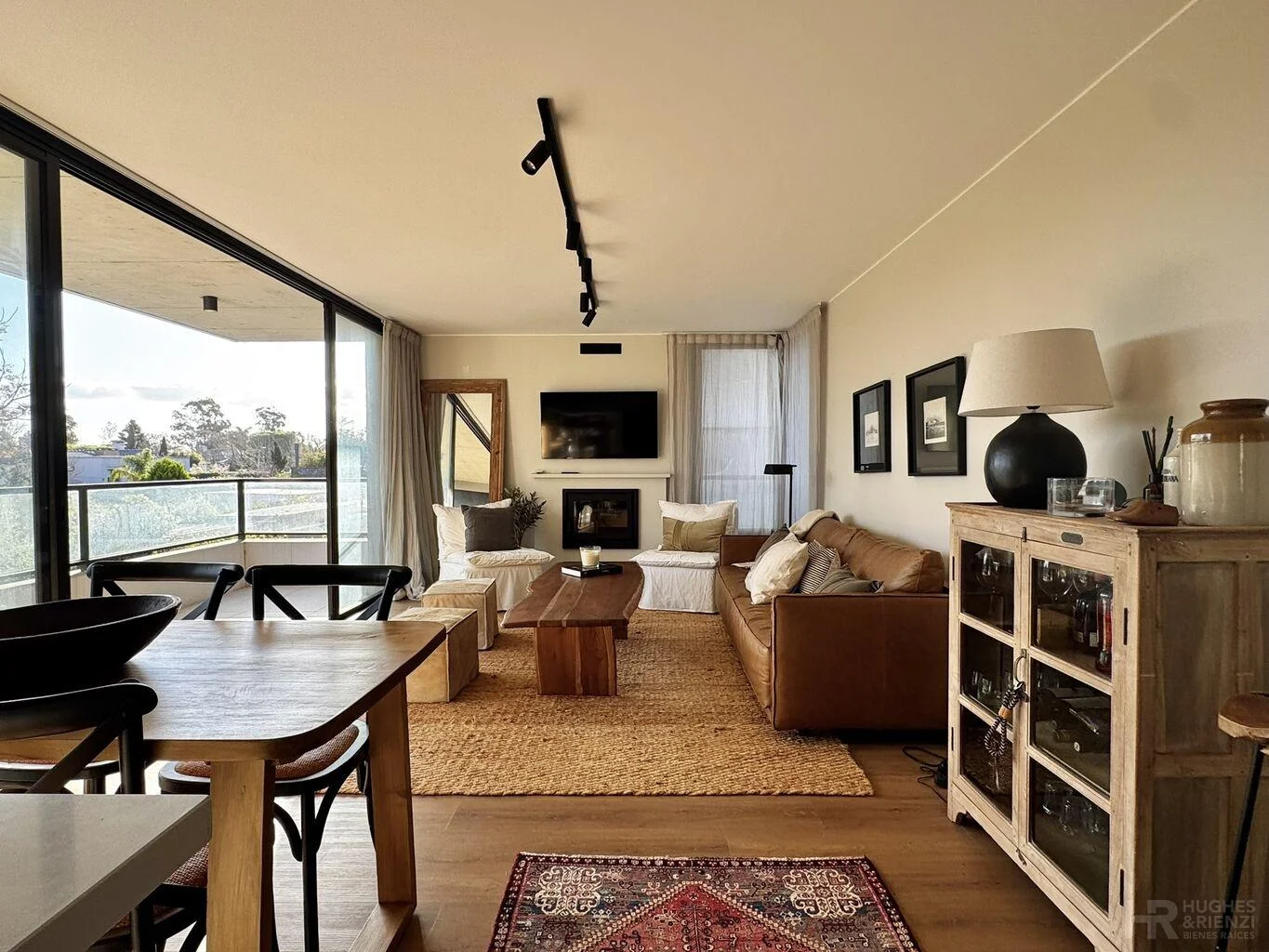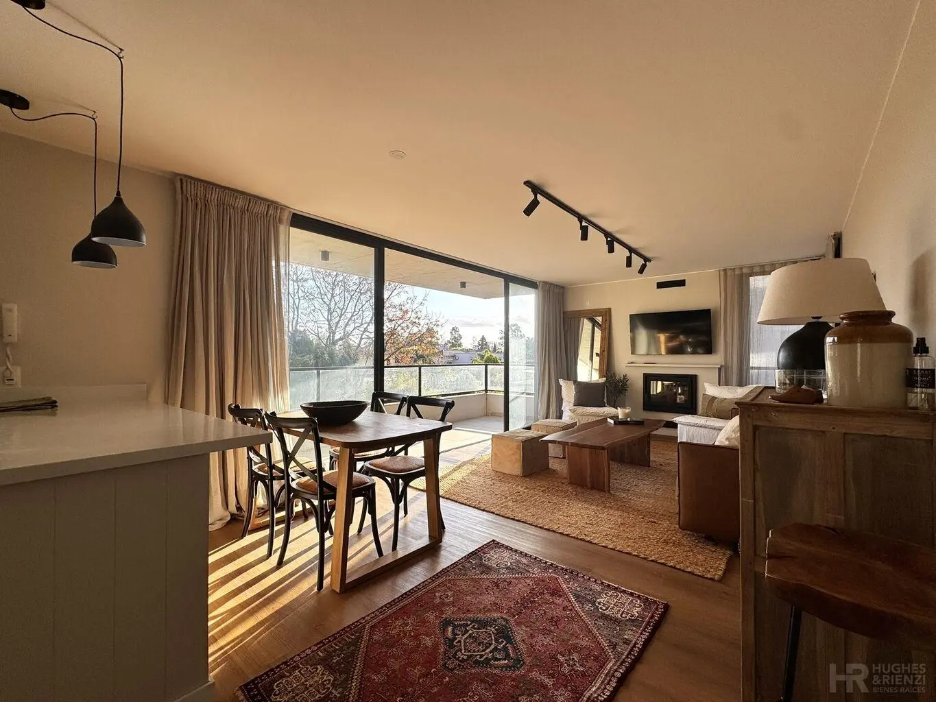Living-comedor con estufa a leña de AA con salida a terraza con parrillero, vista despejada y todo el sol del noroeste.