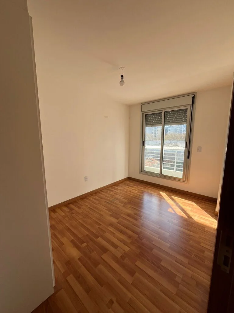 Los pisos son de porcelanato en living, cocina y baño, piso flotante símil madera en dormitorios.