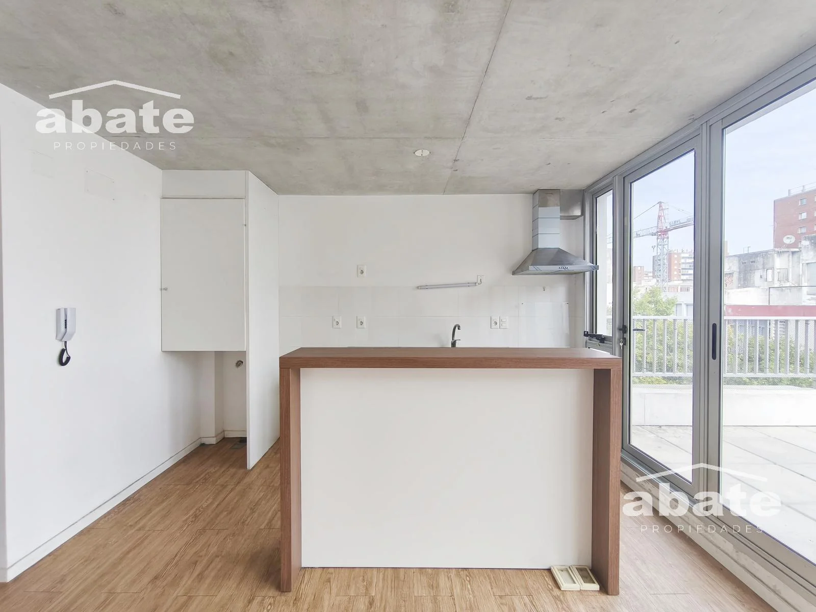 Cocina integrada con muebles bajo mesada, barra, campana extractora, cocina eléctrica, conexión para calefón y para lavarropas.