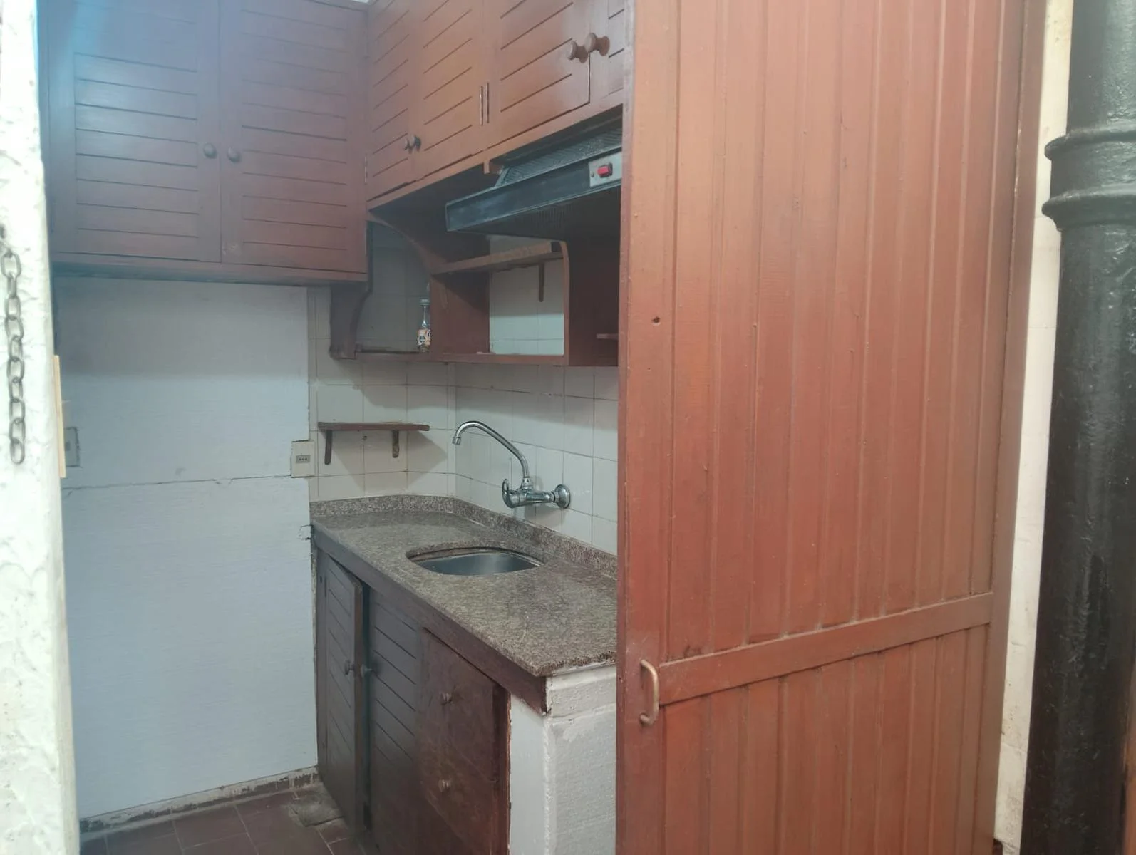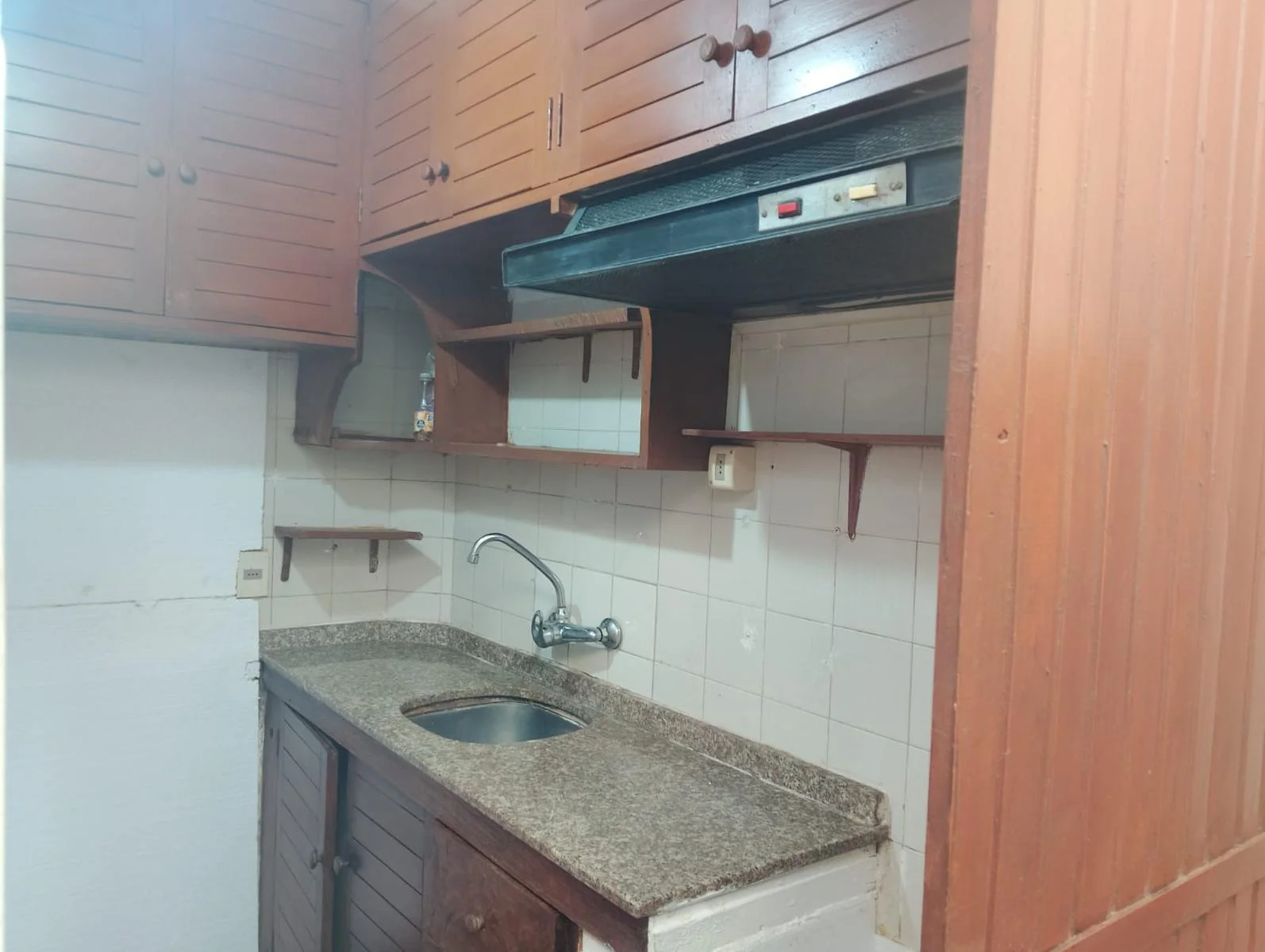cocina completa con extractor, muebles bajo y sobre mesada