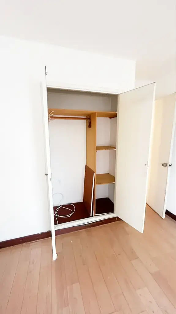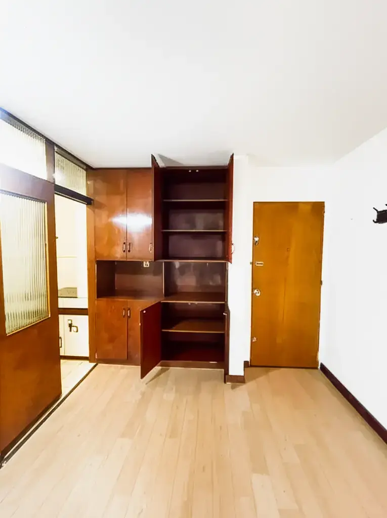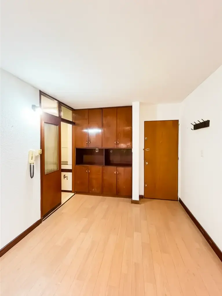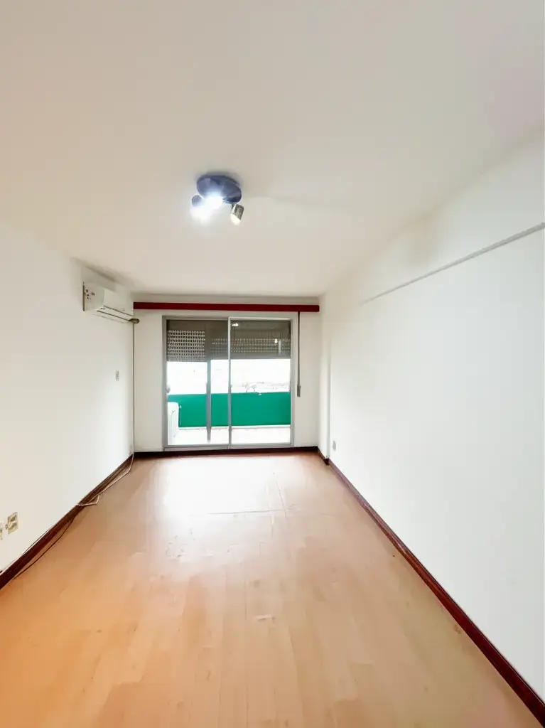 Un dormitorio con placard y aire acondicionado, living comedor, cocina definida, baño completo.