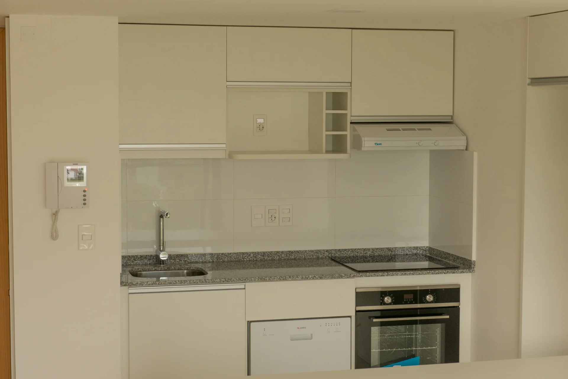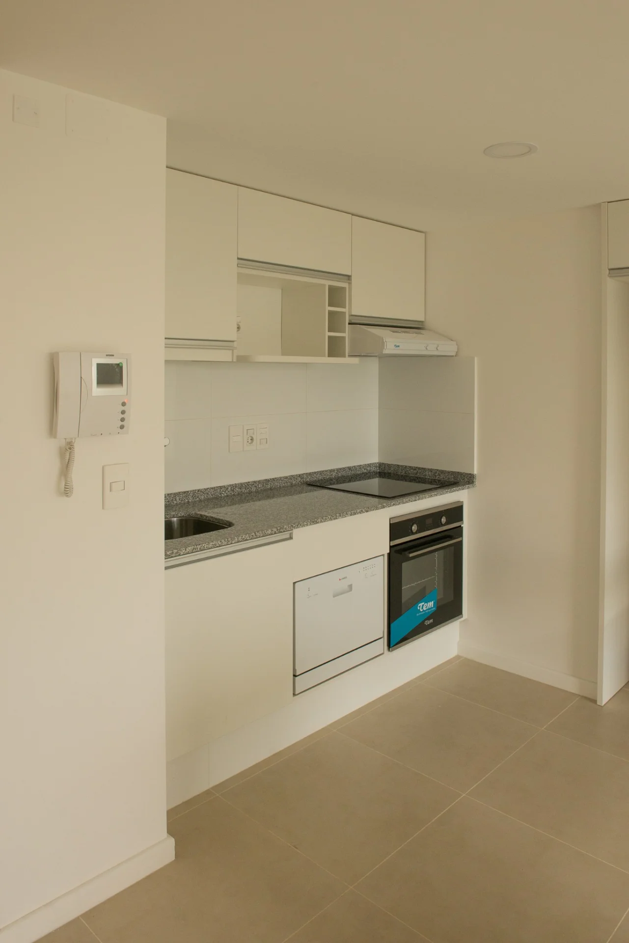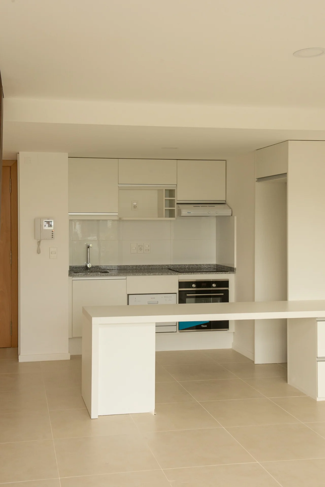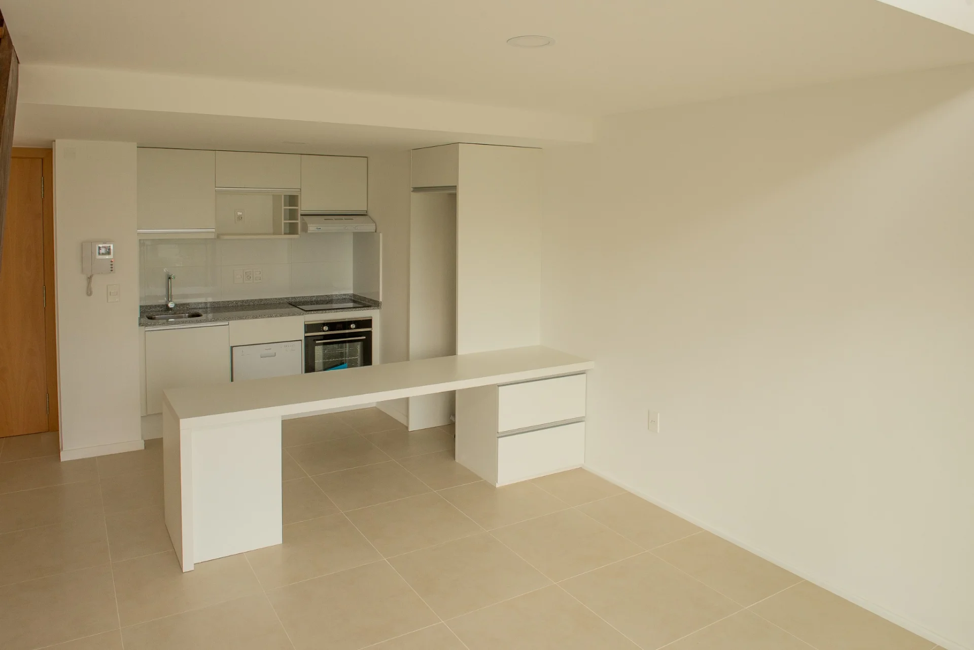 Cocina integrada con barra equipada con horno, anafe, campana, lavavajillas, placares aéreos y bajo mesada