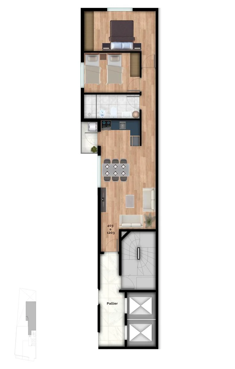 Consta de dos dormitorios, un baño y cocina integrada al living comedor.Se destaca la luminosidad y la carpintería de madera.