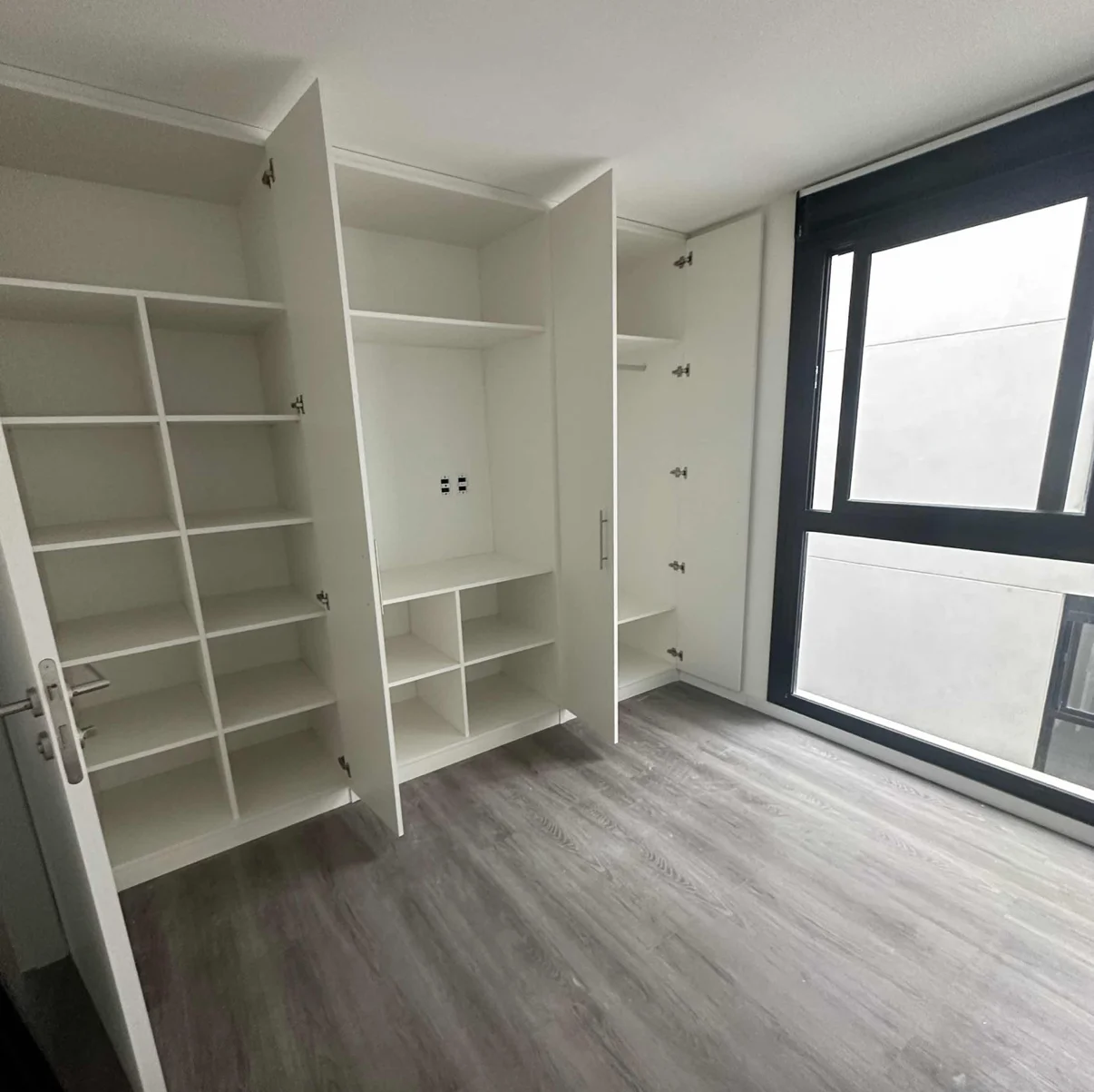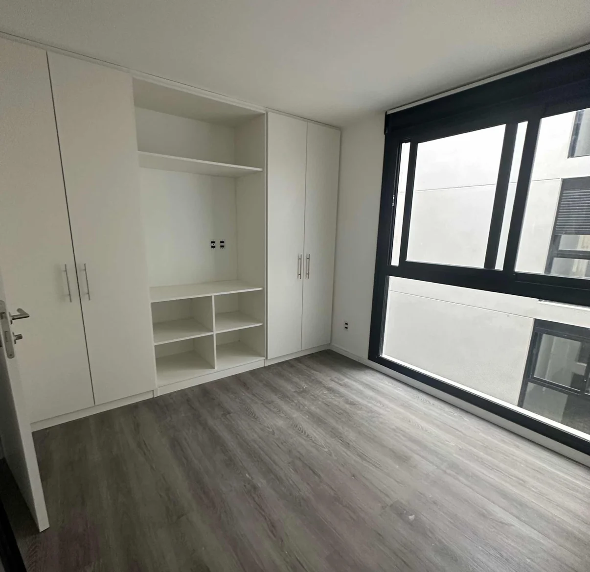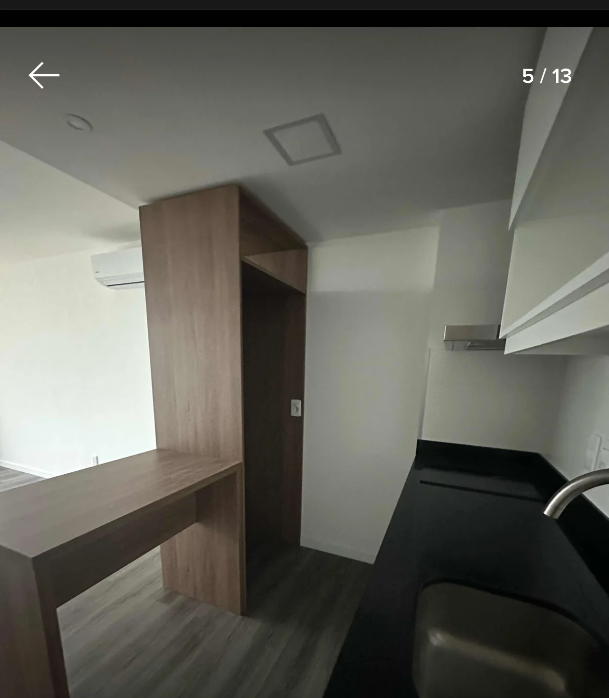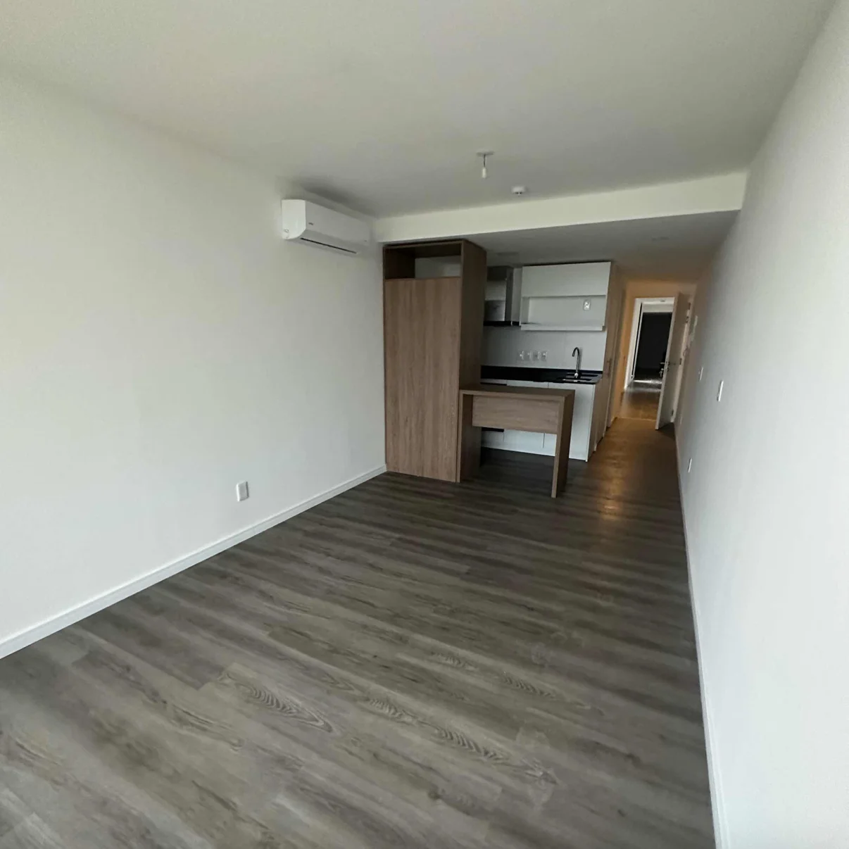 Entrada al living con cocina semiintegrada con horno, anafe y campana, y aire acondicionado