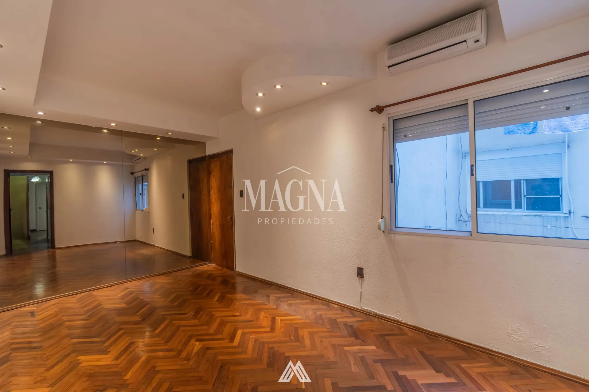 • Living comedor con piso de parquet, pared de espejos que aportan amplitud, luz y modernidad. Ventana al pozo de aire y aire acondicionado.