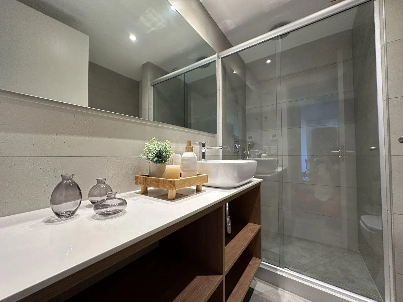 Baño amplio, completo con mampara de cristal y espejo. Calefacción eléctrica individual en el baño.