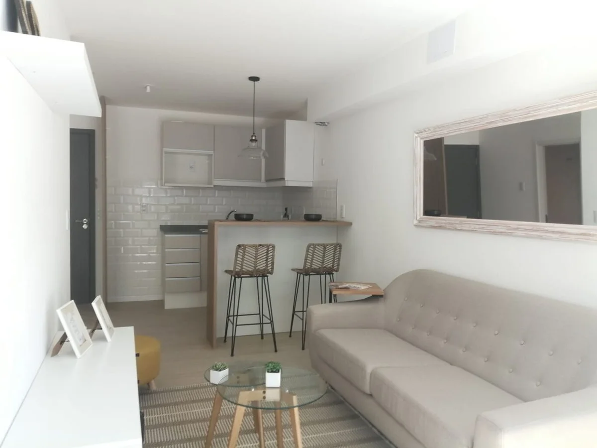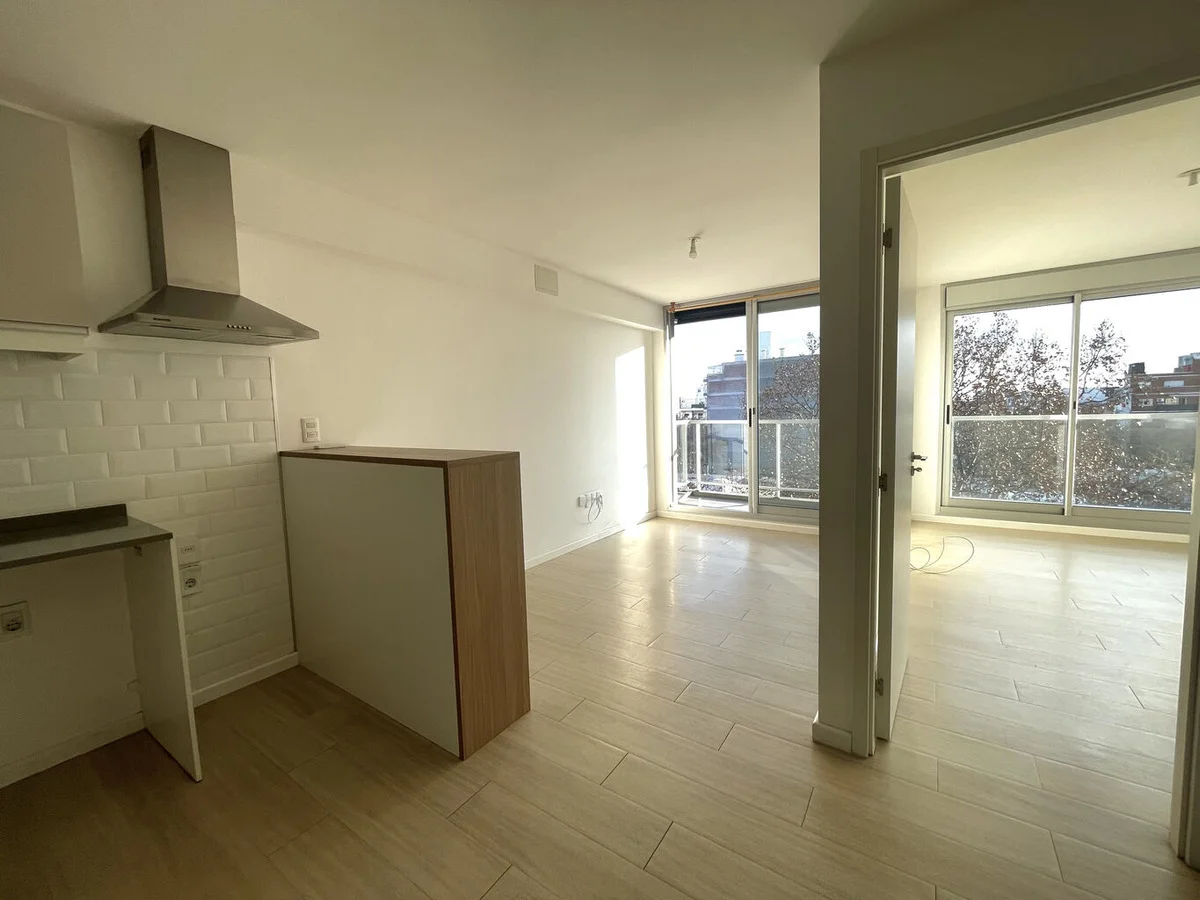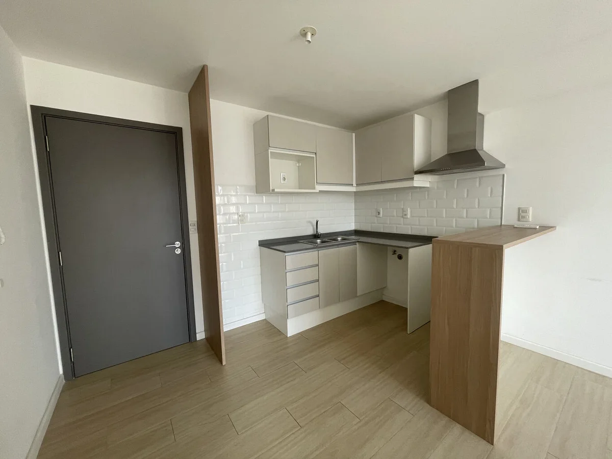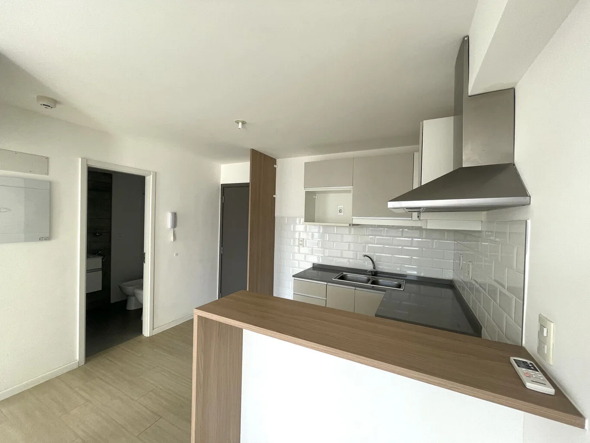Cocina integrada a través de barra estilo americano, con campana instalada, placares aéreos y bajo mesada, nicho con previsión para lavarropas de carga frontal.