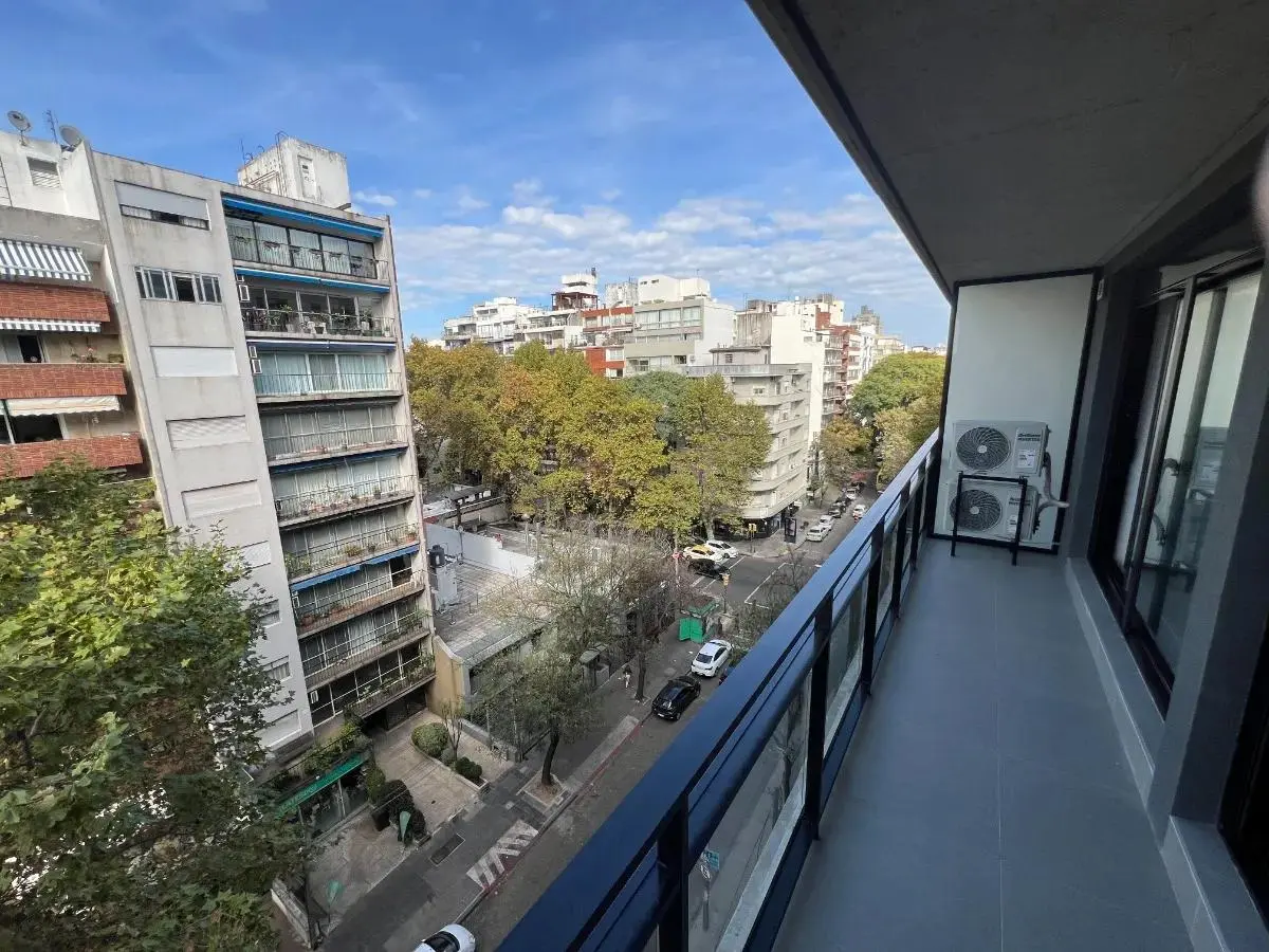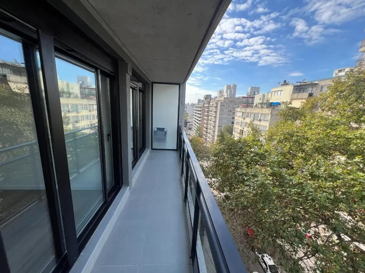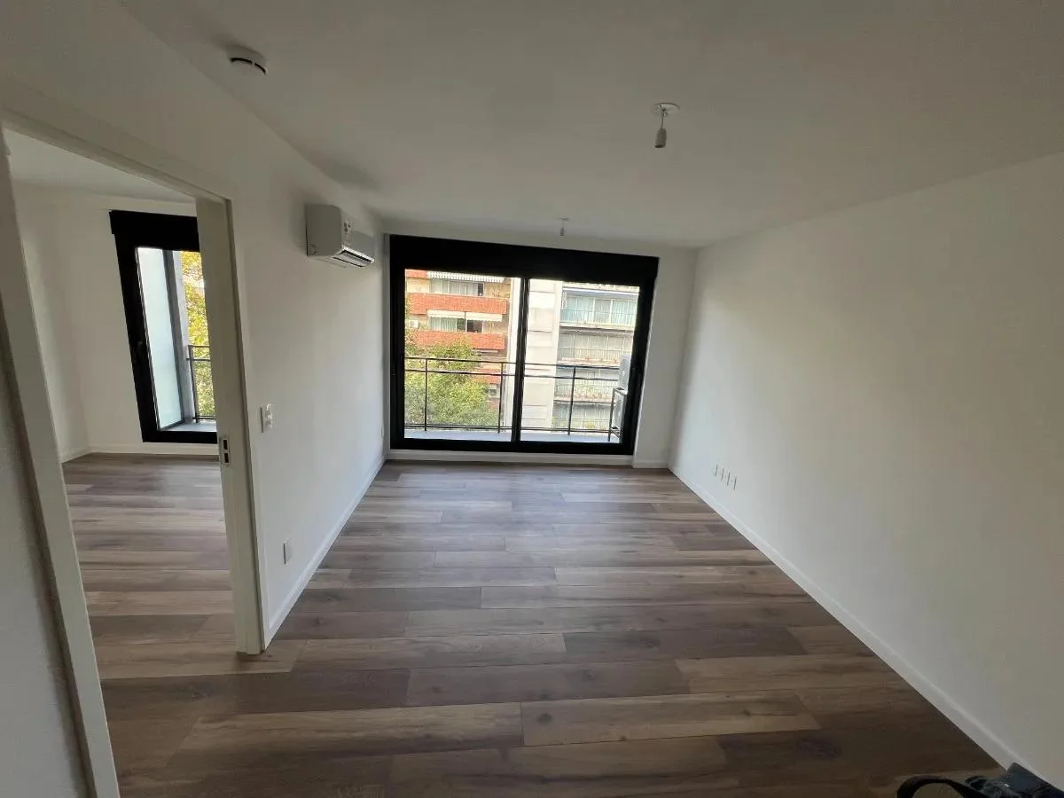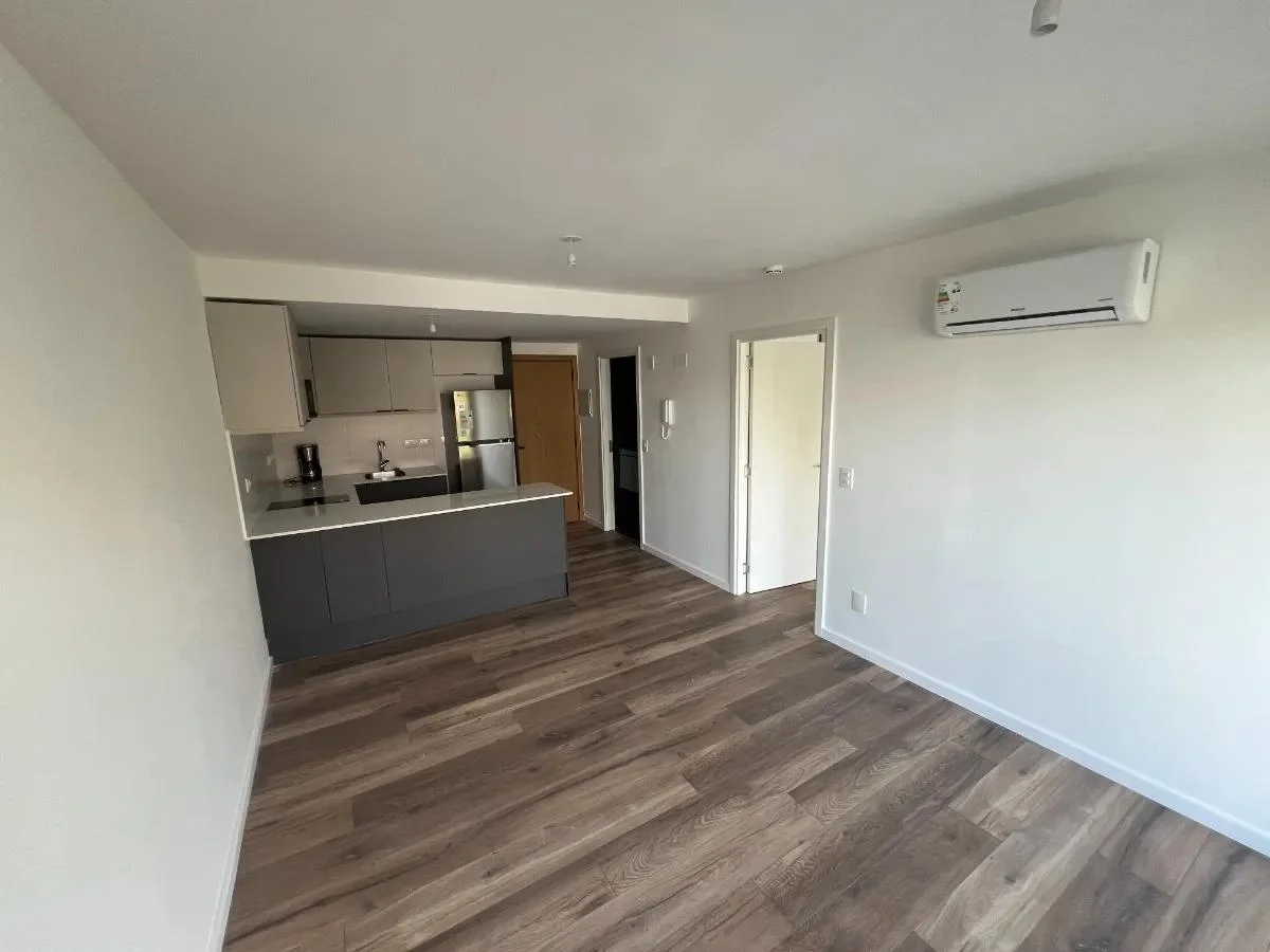 El apartamento cuenta con 1 dormitorio con un cómodo placard empotrado y aire acondicionado, un living comedor luminoso también equipado con aire acondicionado y con salida a un balcón de 6 m², ideal para disfrutar al aire libre. La cocina integrada está equipada con muebles bajo mesada y aéreos, campana extractora, anafe, horno empotrado, desayunador, heladera, microondas y cafetera. El baño es completo y cuenta con calefón instalado.