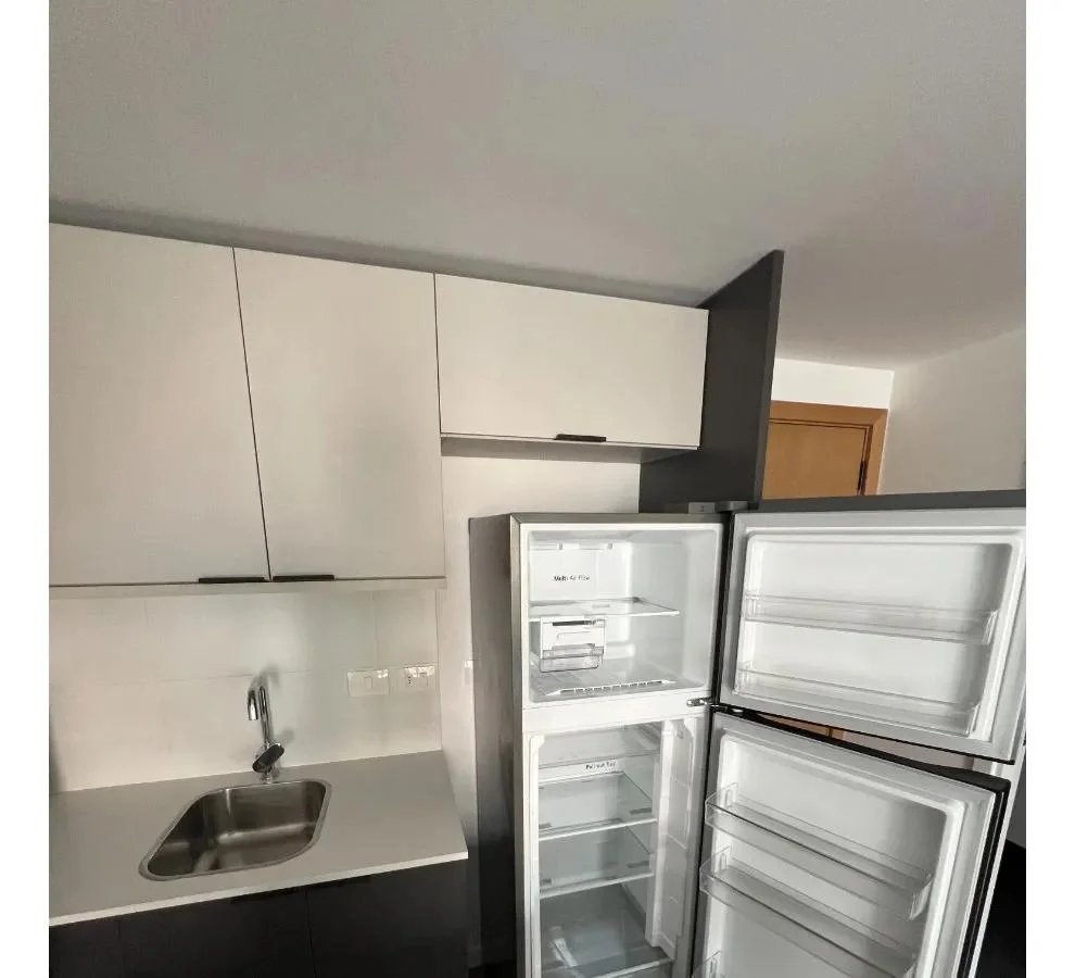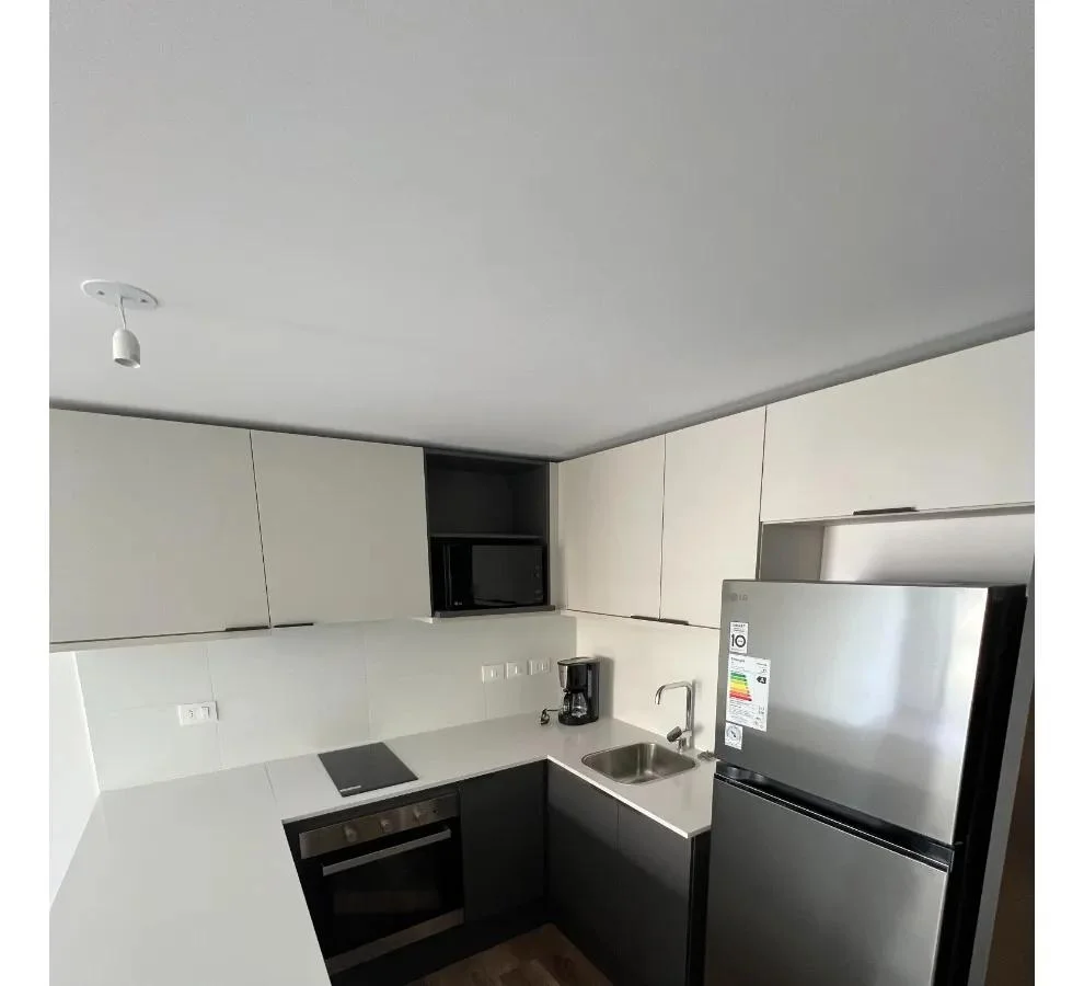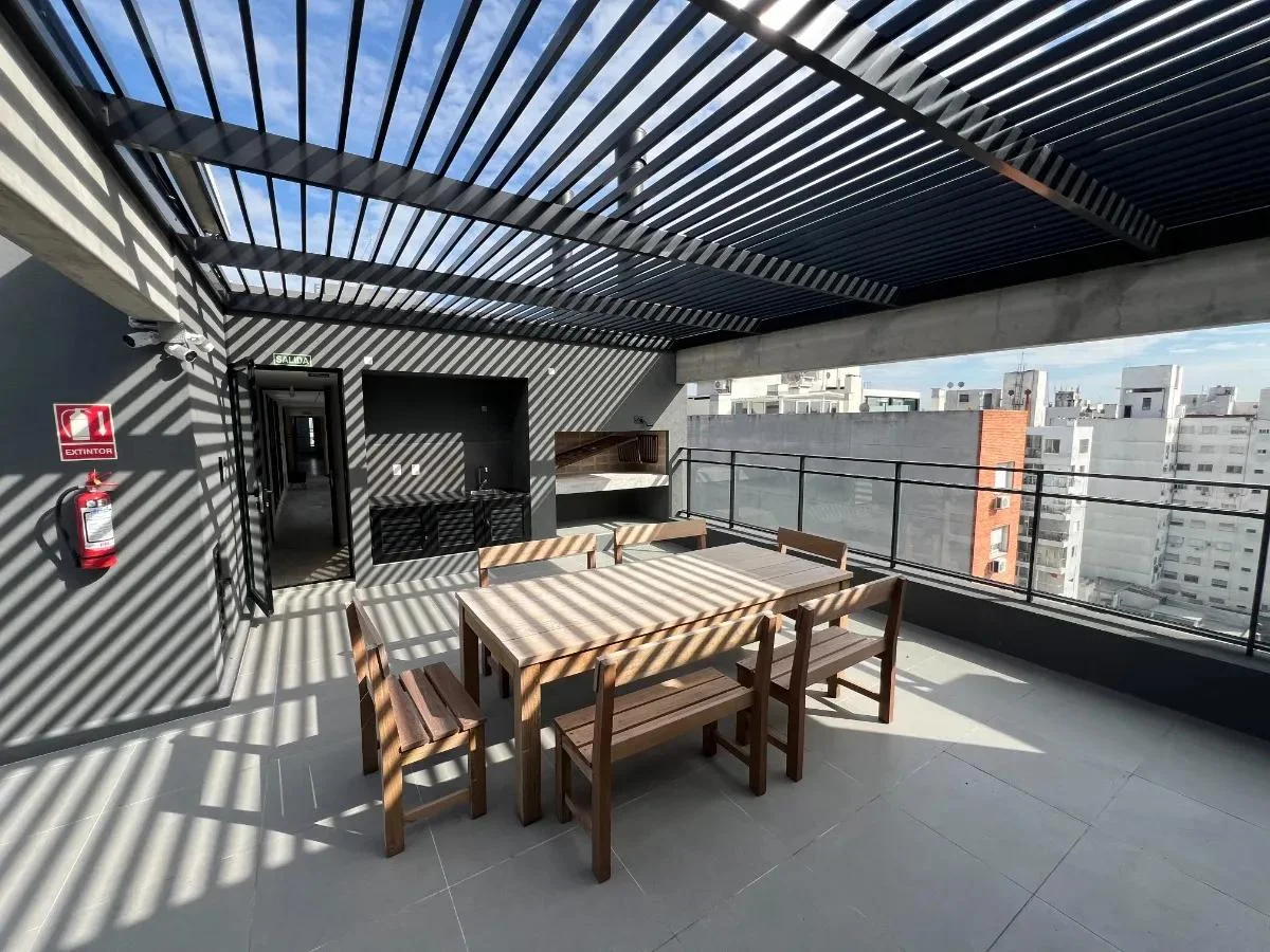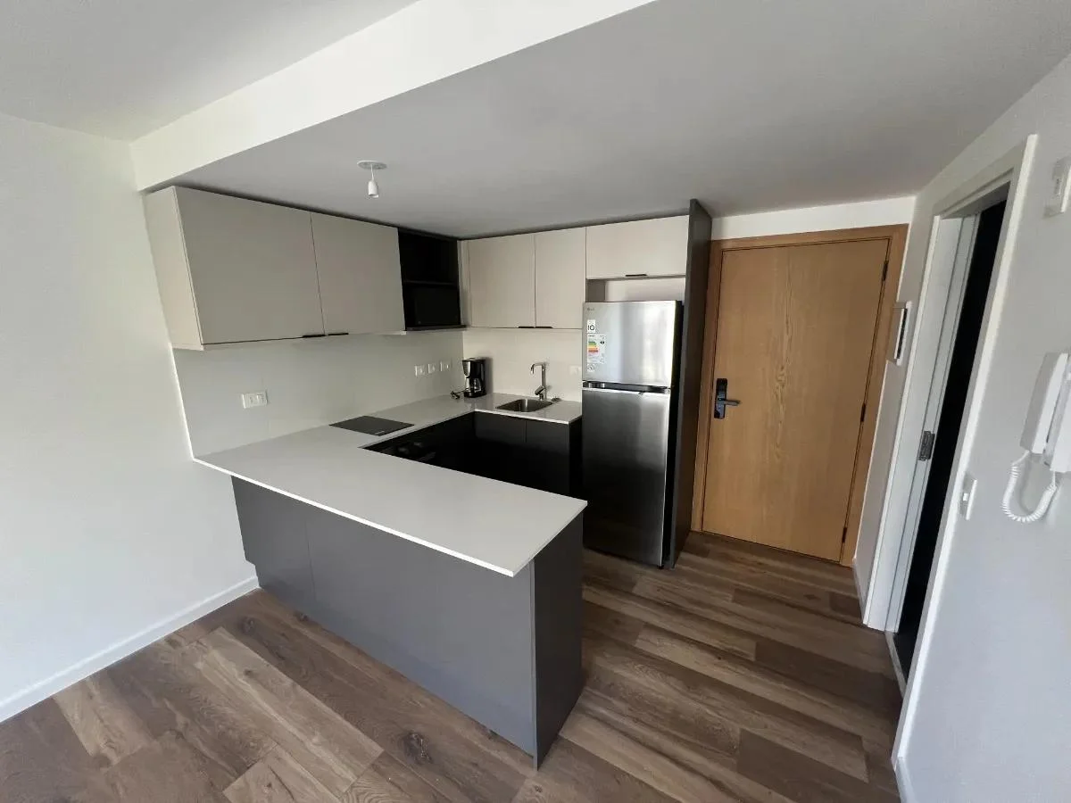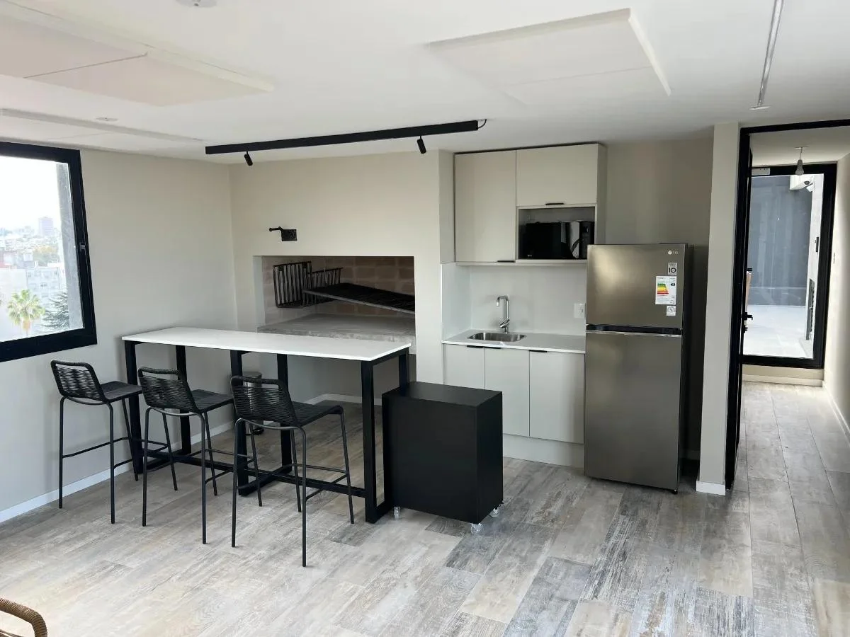 El apartamento cuenta con 1 dormitorio con un cómodo placard empotrado y aire acondicionado, un living comedor luminoso también equipado con aire acondicionado y con salida a un balcón de 6 m², ideal para disfrutar al aire libre. La cocina integrada está equipada con muebles bajo mesada y aéreos, campana extractora, anafe, horno empotrado, desayunador, heladera, microondas y cafetera. El baño es completo y cuenta con calefón instalado.