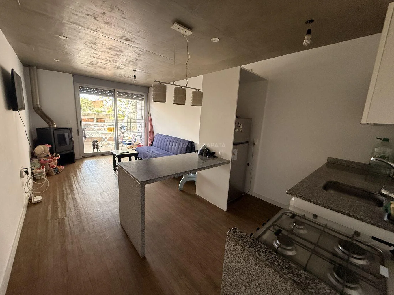 Amplio living comedor con cocina integrada, gran capacidad de placares, estufa a leña de alto rendimiento