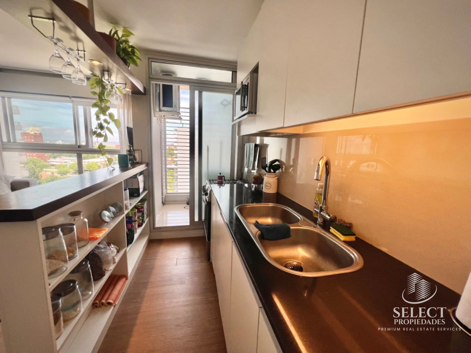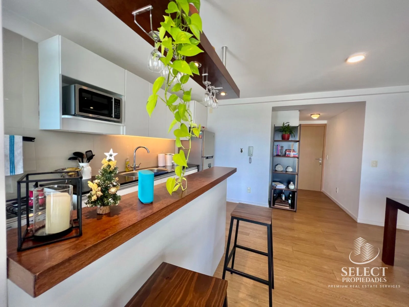 Cuenta con living comedor con cocina semi integrada con barra desayunadora.