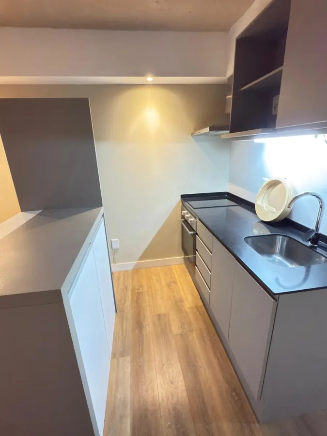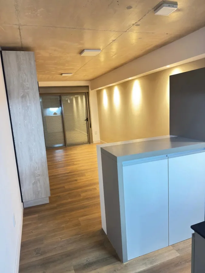. Cocina integrada con anafe de votroceramica, horno empotrado e isla con mueble de gran lugar de guardado