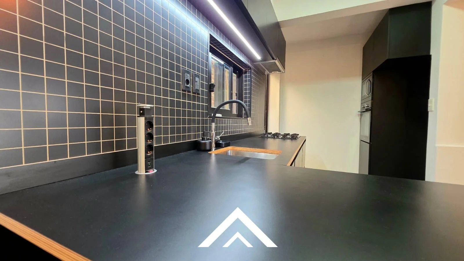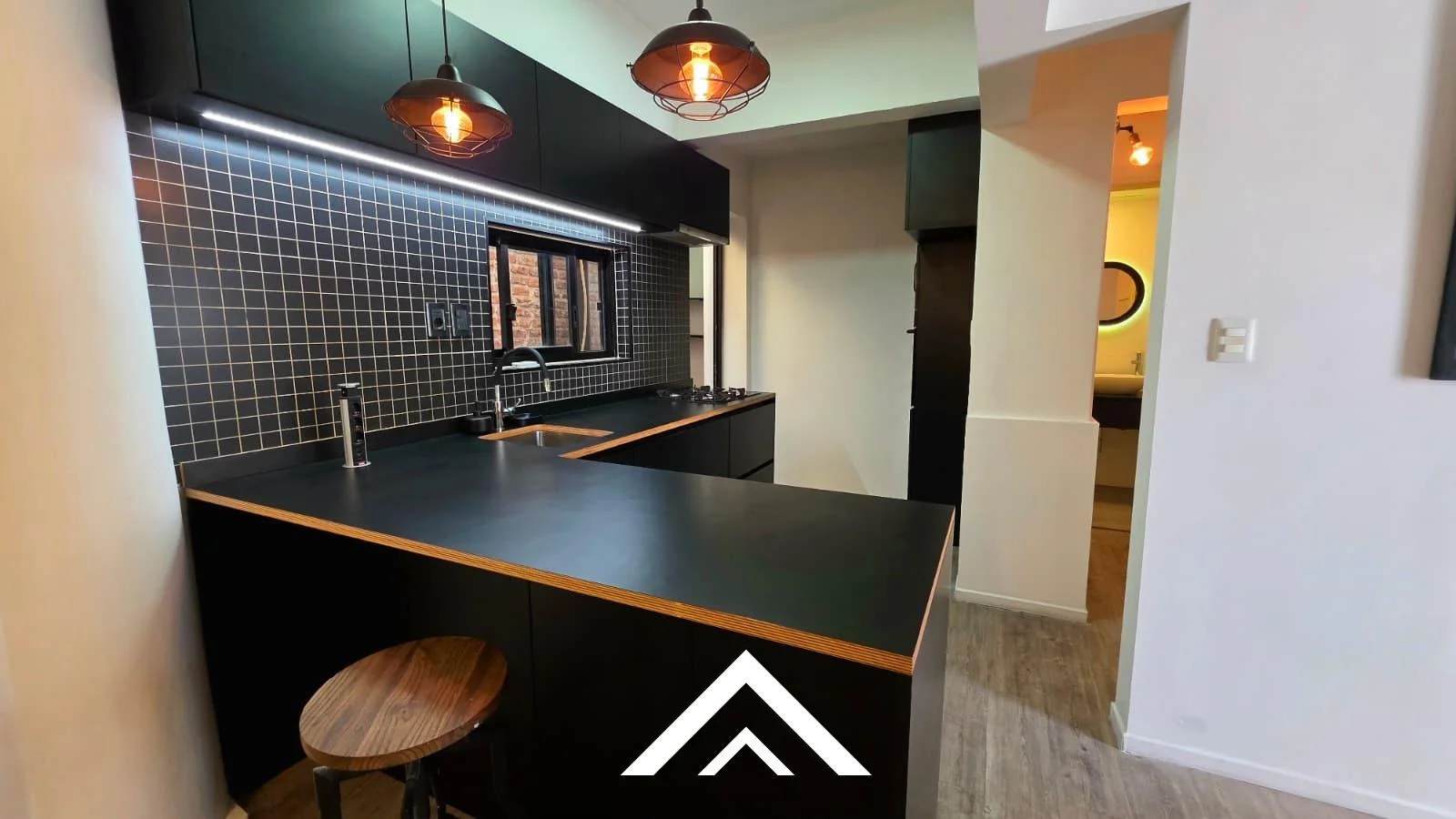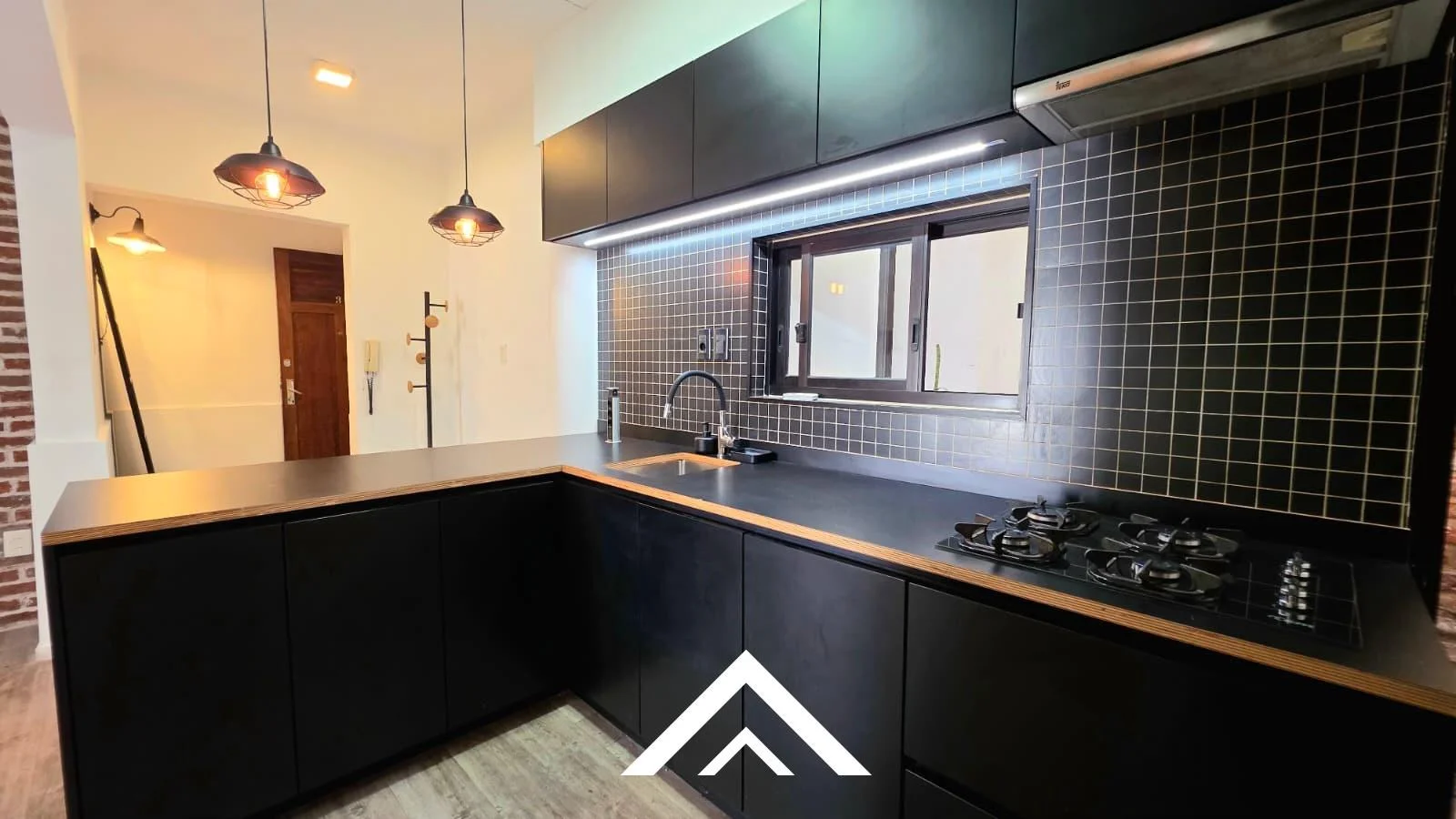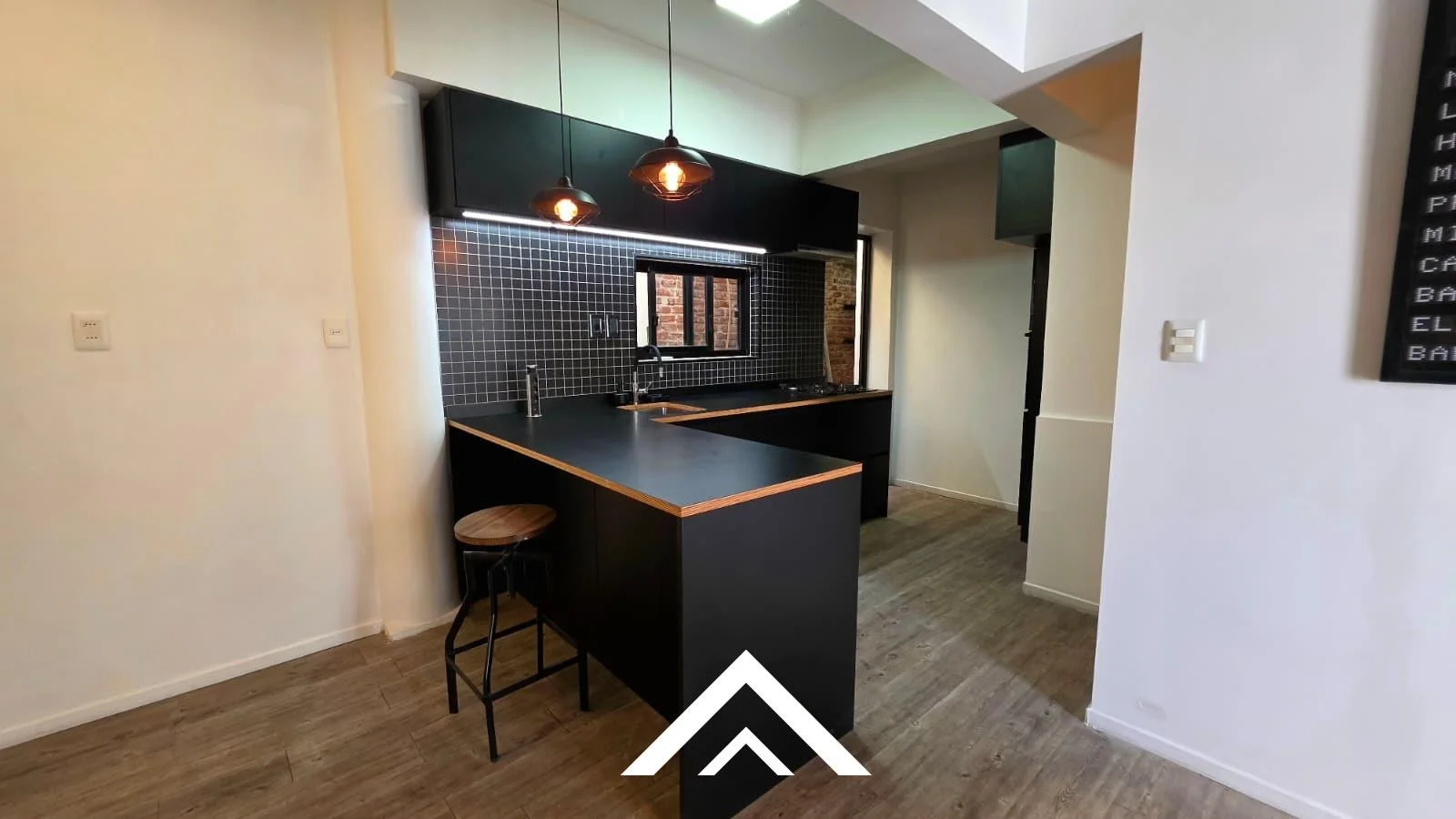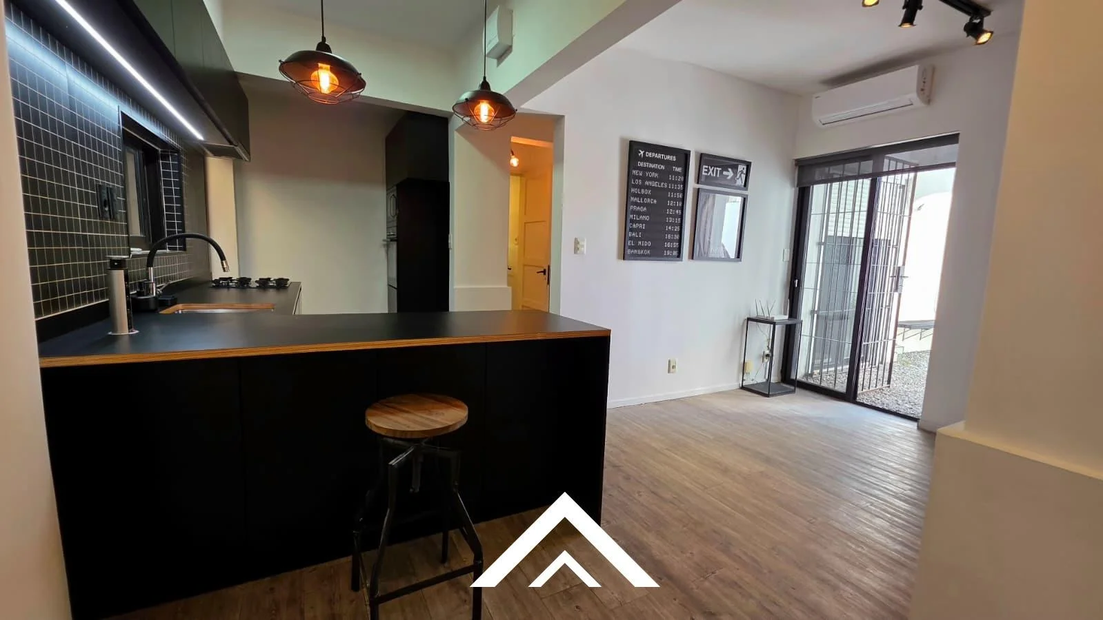 + Cocina tipo americana semi integrada con gran capacidad de almacenamiento en muebles bajo mesada, barra tipo desayunador con tres bancos, anafe, horno, microondas, campana extractora empotrada y ventilación natural.