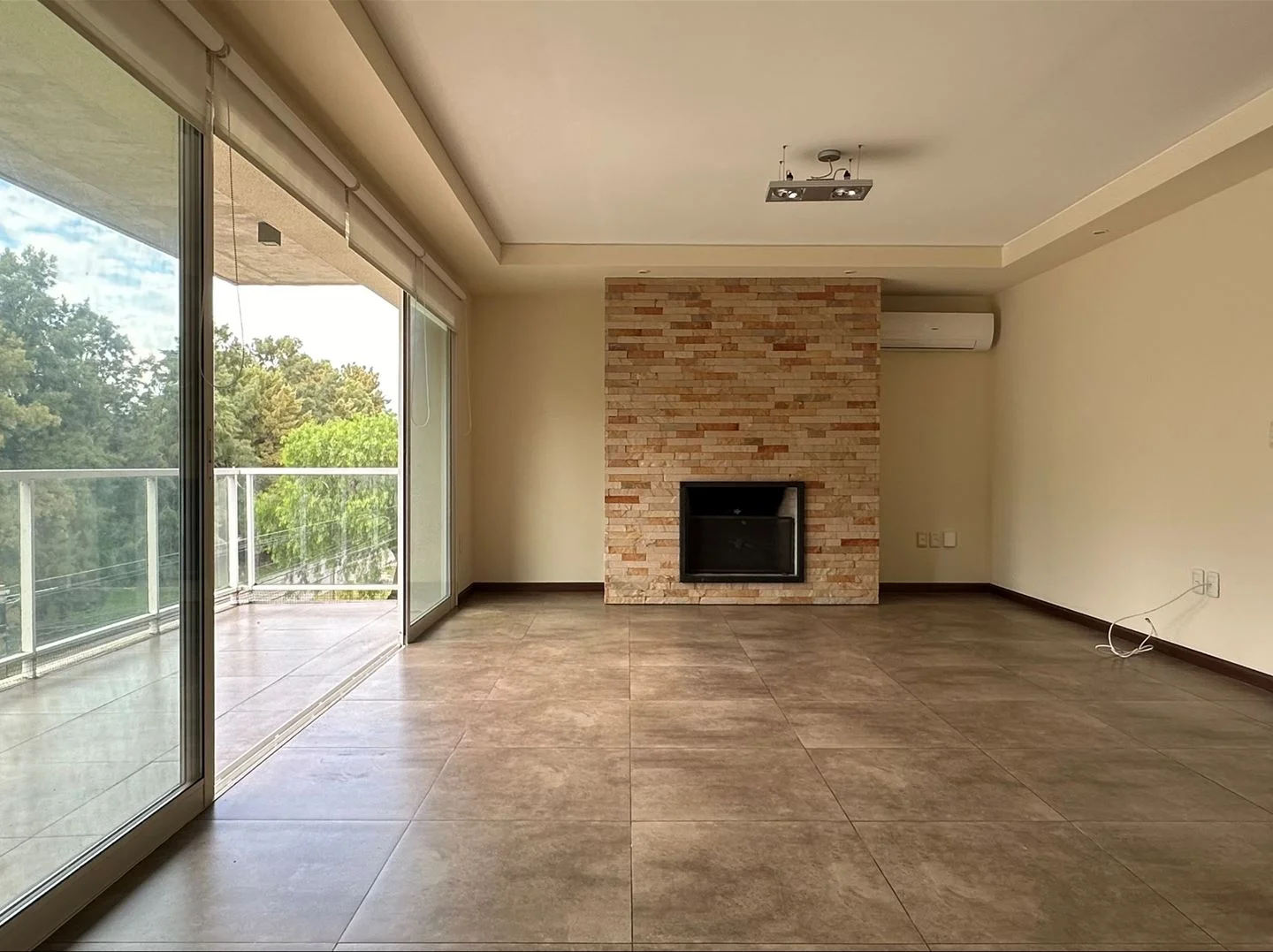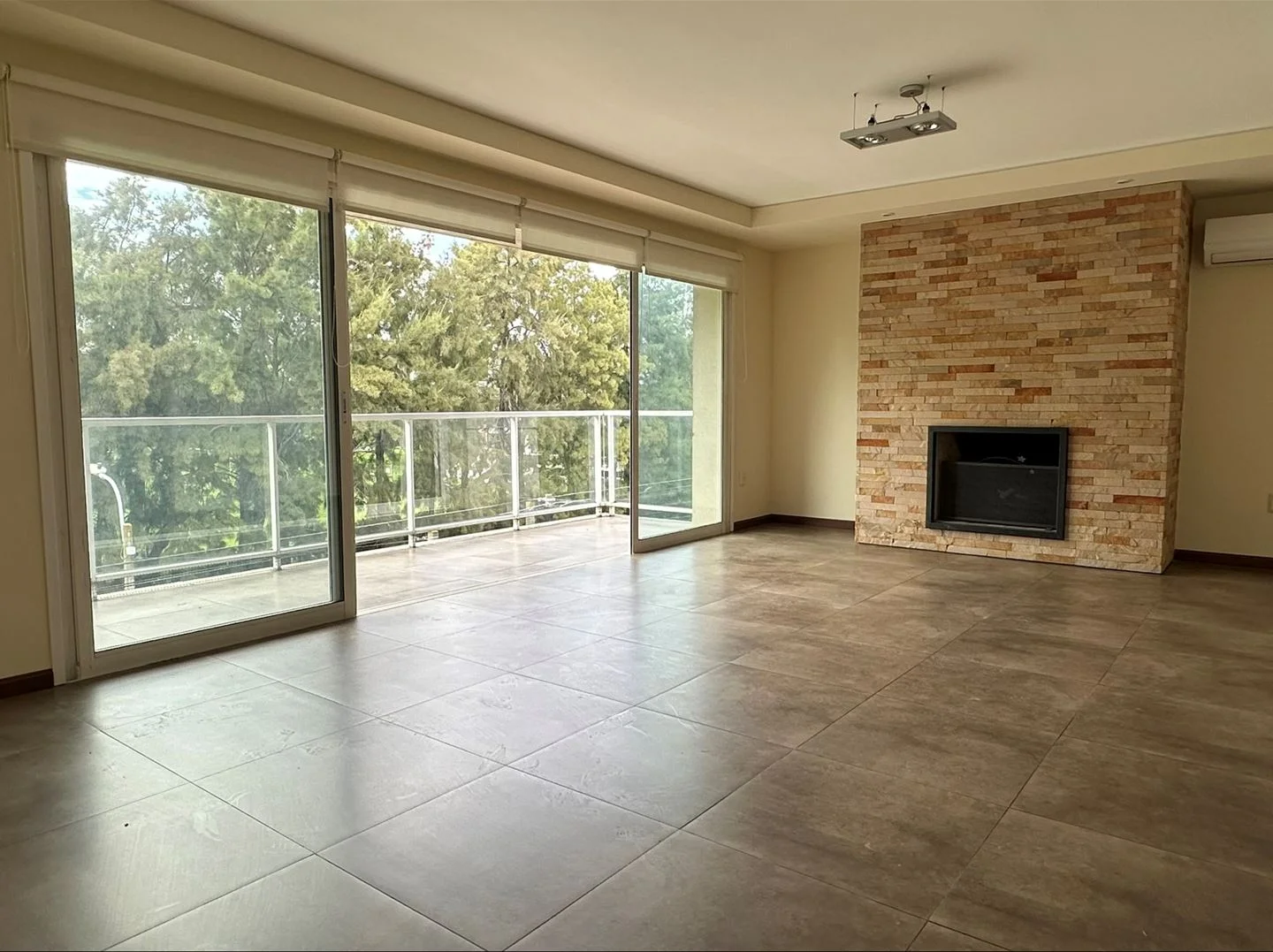 Living comedor con estufa a leña, con salida a buena terraza con parrillero, entorno verde.