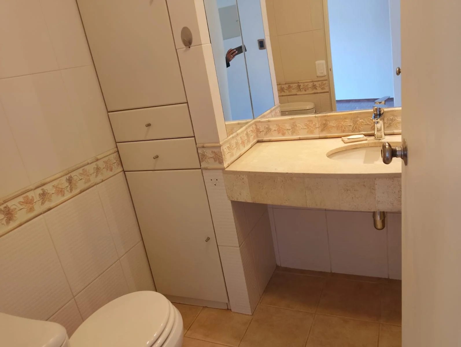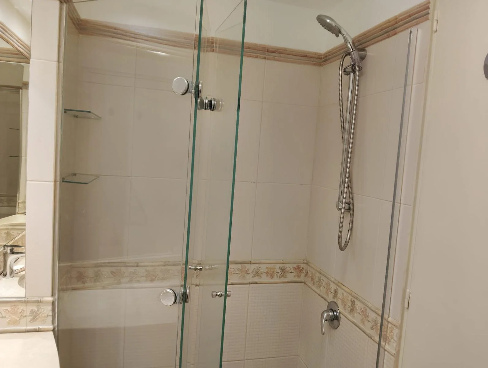 - Baño completo con espacio para guardado, espejo amplio y mampara