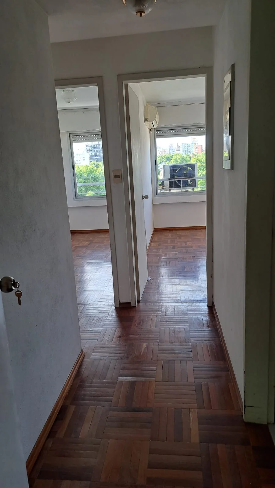 La unidad cuenta con Living Comedor al frente con salida al balcón, 2 dormitorios con placares, uno de ellos con aire acondicionado, ambos con ventanas y persianas, teniendo una buena ventilación e iluminación. Todos los ambientes antes mencionados con piso de parquet.