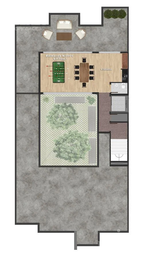 En el último piso cuenta con amplia barbacoa equipada para 25 personas con salida a estupenda terraza para disfrutar una hermosa vista y el sol.