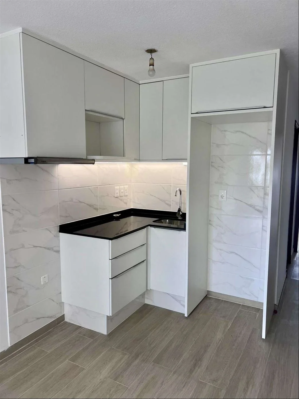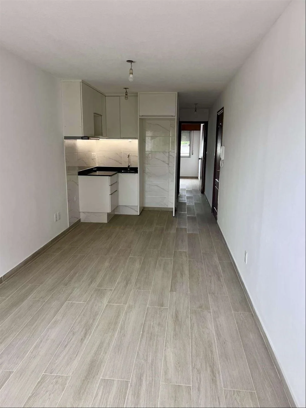 Living comedor con terraza, vista despejada 1 dormitorio muy soleado con placar, 1 baño completo con conexión para lavarropas y cocina integrada con placares y campana con extractor.